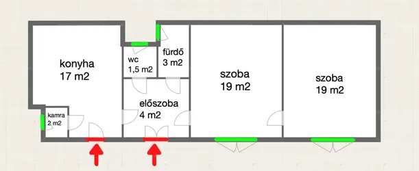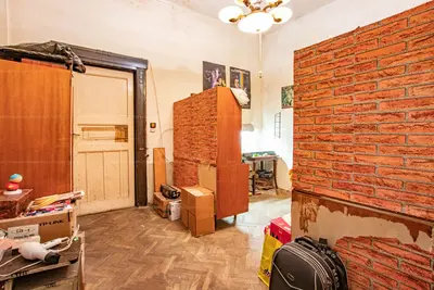 A lakáshoz két bejárat tartozik, így akár két külön lakássá alakítható. A belmagasság 3,5 méter, az ablakok és a bejárat is egyaránt az udvarra néznek, az ablakok nagyok (2,3 x 2 m). Az egyik bejárat a tágas konyhába vezet, ami 20 m2, mellette a másik bejárat az előtérbe nyílik. Az előtérből jobbra nyílik a két jelenlegi szoba, mindkettő nagysága 20 m2. A lakáshoz pincehelység is tartozik.