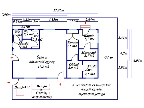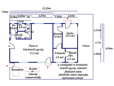 A 2004-ben épült összkomfortos ingatlan, közvetlenül a város főútjához épített, aszfaltozott kamion forduló mellett helyezkedik el. A három bejáratú épületben egy 47 m2 nagyságú büfé és kezelő-helyiség, a hozzá tartozó szociális helyiségek, valamint egy konyha, egy öltöző, egy tároló, egy fekete mosogató és egy fürdőszoba-WC helyiség kapott helyet. Az ingatlan egy 150 m2 nagyságú, részben bekerített, közjegyzői okirattal alátámasztott, 75 évre bérelt területen helyezkedik el, melyet három oldalról U-alakban vesz körbe a rendezett udvar. Az udvar kerítéssel leválasztott részén, egy osztott 5.500 literes benzin és 14.500 literes gázolaj befogadására alkalmas, szabványos dupla falú, fagyállóval feltöltött, szivárgás-vizsgálóval ellátott kiszolgáló tartály és benzinkút létesült. Az épület beton alapon porotherm téglából, 10 cm-es homlokzati hőszigeteléssel és kőporozással épült. A fa tetőszerkezet beton födémmel, hullámcserepes lemez borítással készült, körben csatornával ellátott. A külső nyílászárók dupla üvegezésű fa szerkezetűek, a belsők jó állapotú normál fa szerkezetűek. A helyiségek járólap borításúak. Az ingatlan összközműves: a villany, a gáz, a vezetékes víz és a csatorna bevezetésre került. A benzinkút és a kiszolgáló egység 2009-ig üzemelt, így a közművek jelenleg ki vannak kötve. Az ingatlan fűtését és a melegvíz ellátást kombi gáz-cirko kazán biztosítja részben padlófűtéses hőleadással, alternatív megoldásként egy klíma is beszerelésre került. A benzinkút engedélye időközben lejárt, újraengedélyeztetése és új kútoszloppal történő mobilkúttá való alakítása lehetséges. Megoldható a kiszolgáló egység újbóli beüzemelése és igény szerint az átalakítási vázrajz által elképzelt lakássá alakítása is. Az épület padlásának jelenlegi előkészítése további beépítési lehetőségeket rejt magában, két erkély kialakítása megtörtént. A három bejárati lehetőség miatt az üzemeltetés és a lakhatás elkülönülten zavartalanul biztosítható. Az ingatlan kiváló lehetőség vállalkozás üzemeltetésre, többfunkciós bérbeadásra és lakhatásra egyaránt. Az ingatlan mellett közvetlenül eladó egy 2692 m2 nagyságú telep is, ami igény szerint a kiszolgáló egységhez bevonható. Az ingatlan elhelyezkedése kiváló, a közelben minden megtalálható: óvoda, általános iskola, buszmegálló, élelmiszerbolt, posta, multi áruház, kormányhivatal, gyógyszertár, egészségügyi intézmény néhány percen belül elérhető. A hirdetés tájékoztató jellegű, az ingatlanról pontos adatokat a megtekintést követően a tulajdonos által elmondottak alapján tudunk garantálni! Birtokba adás megbeszélés szerint lehetséges. A vásárlás finanszírozásában az OTP kedvezőbb kamatozású hitelkonstrukcióival tudunk segíteni, sorban állás nélkül! Az adásvételi szerződés lebonyolításához korrekt ügyvédi közreműködést tudunk ajánlani. Amennyiben felkeltettem érdeklődését, hívjon bizalommal! Eladó ingatlanokat keresünk hazai, illetve külföldi partnereink számára.