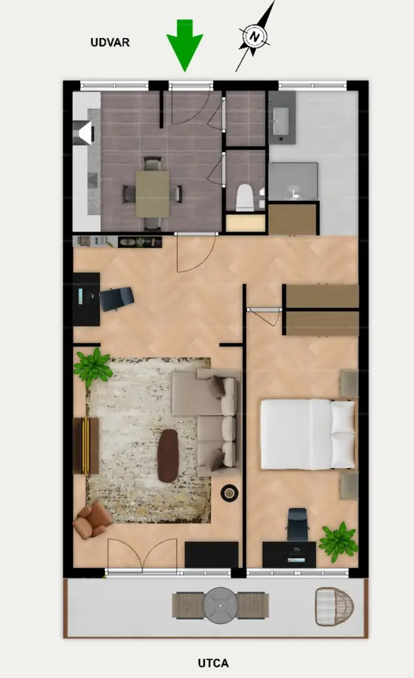 Keleti tájolásának köszönhetően világos, napos, de mégsem túl meleg nyáron. Kellemes hőmérsékletről télen távfűtés, nyáron klíma gondoskodik.