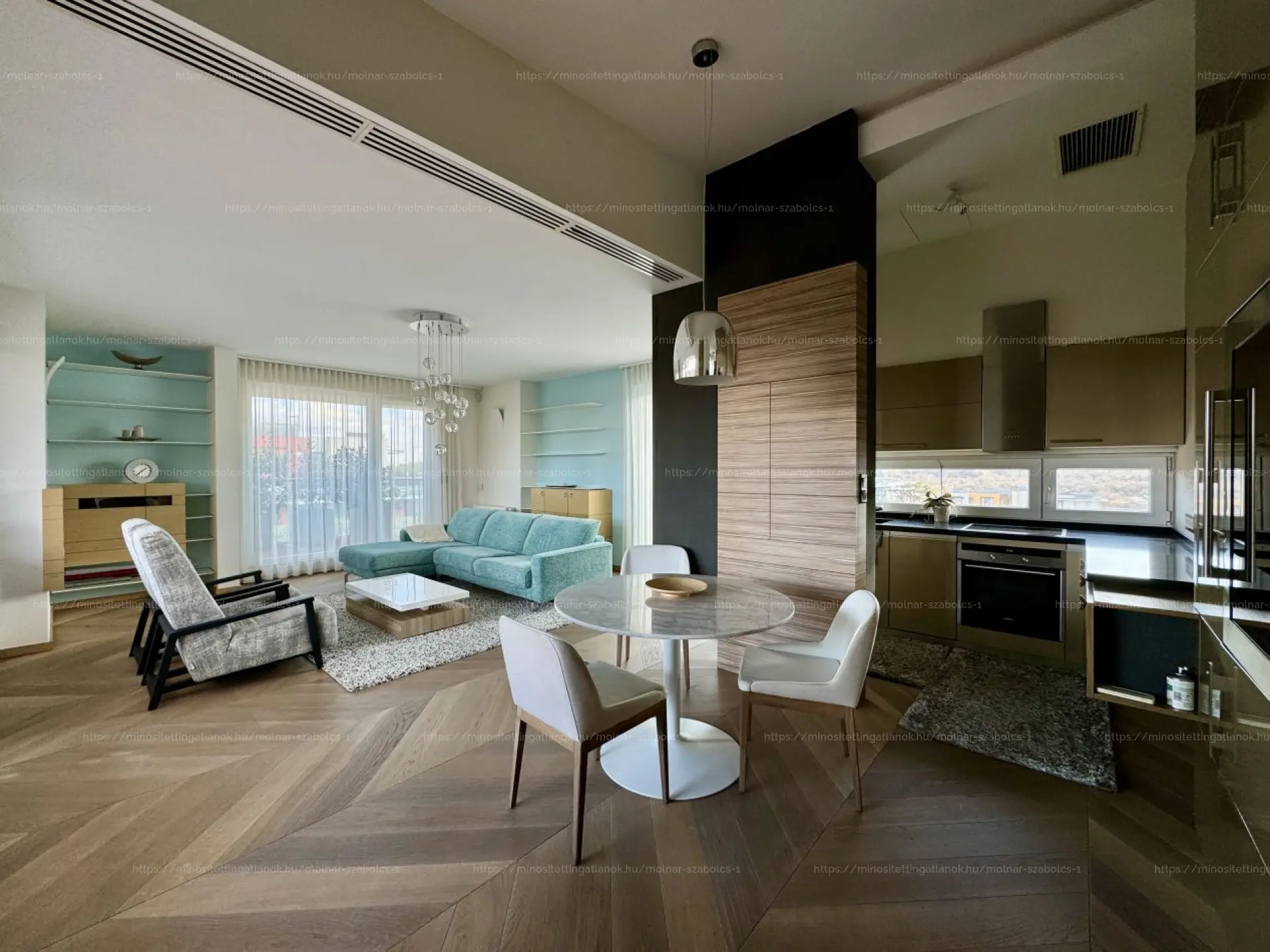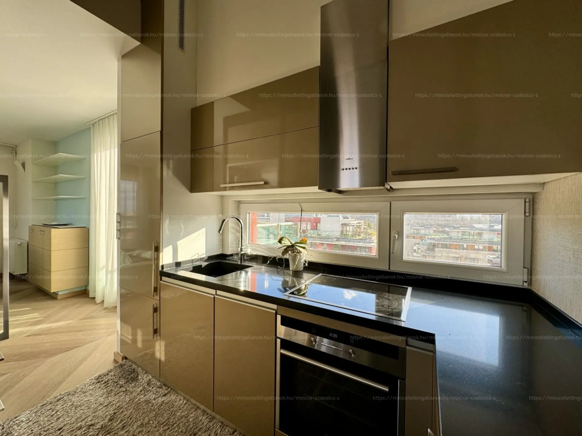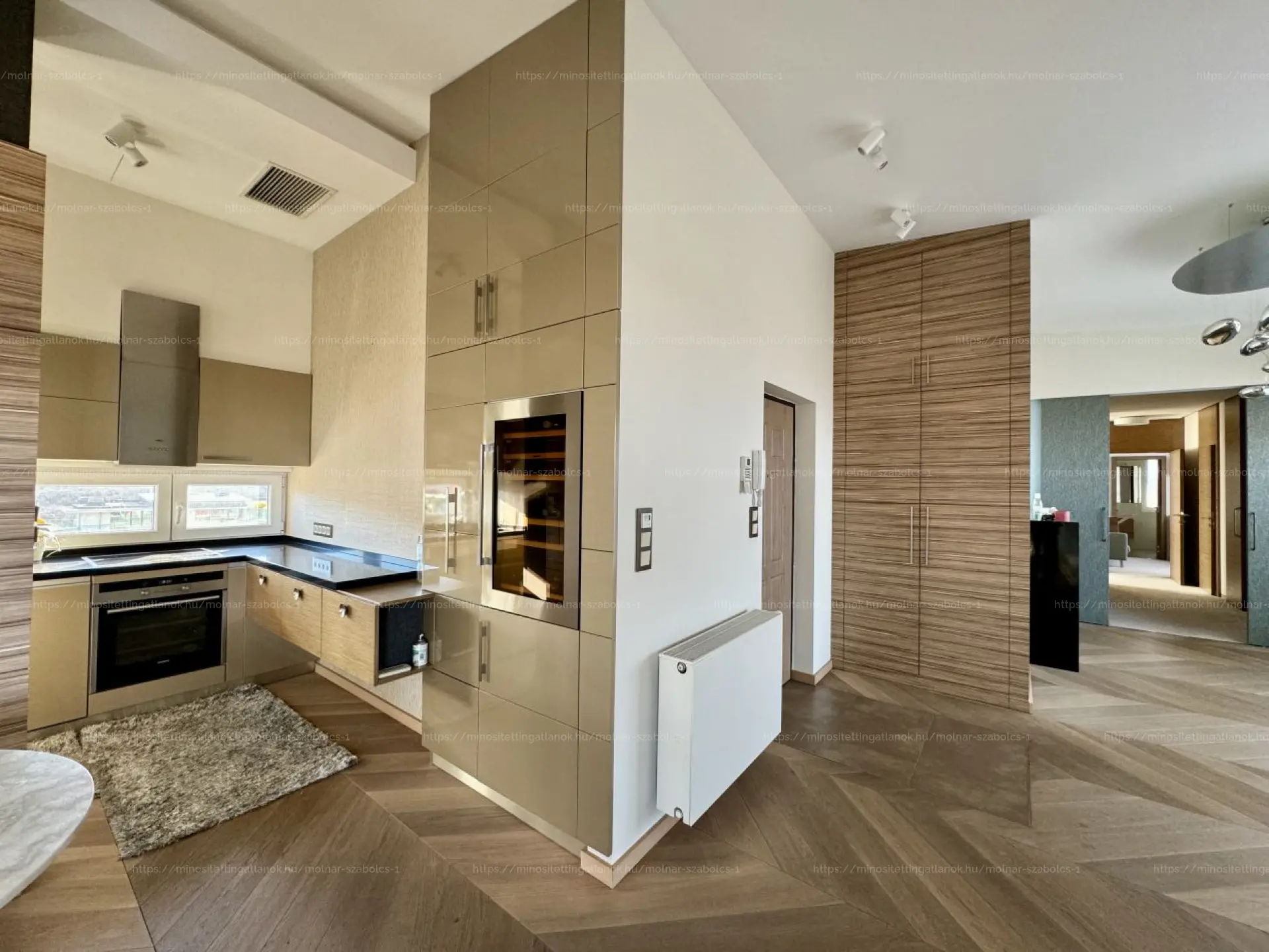 A lakás teljesen felszerelt, kiváló minőségű gépekkel és teljes, egyedi gyártású bútorzattal eladó.