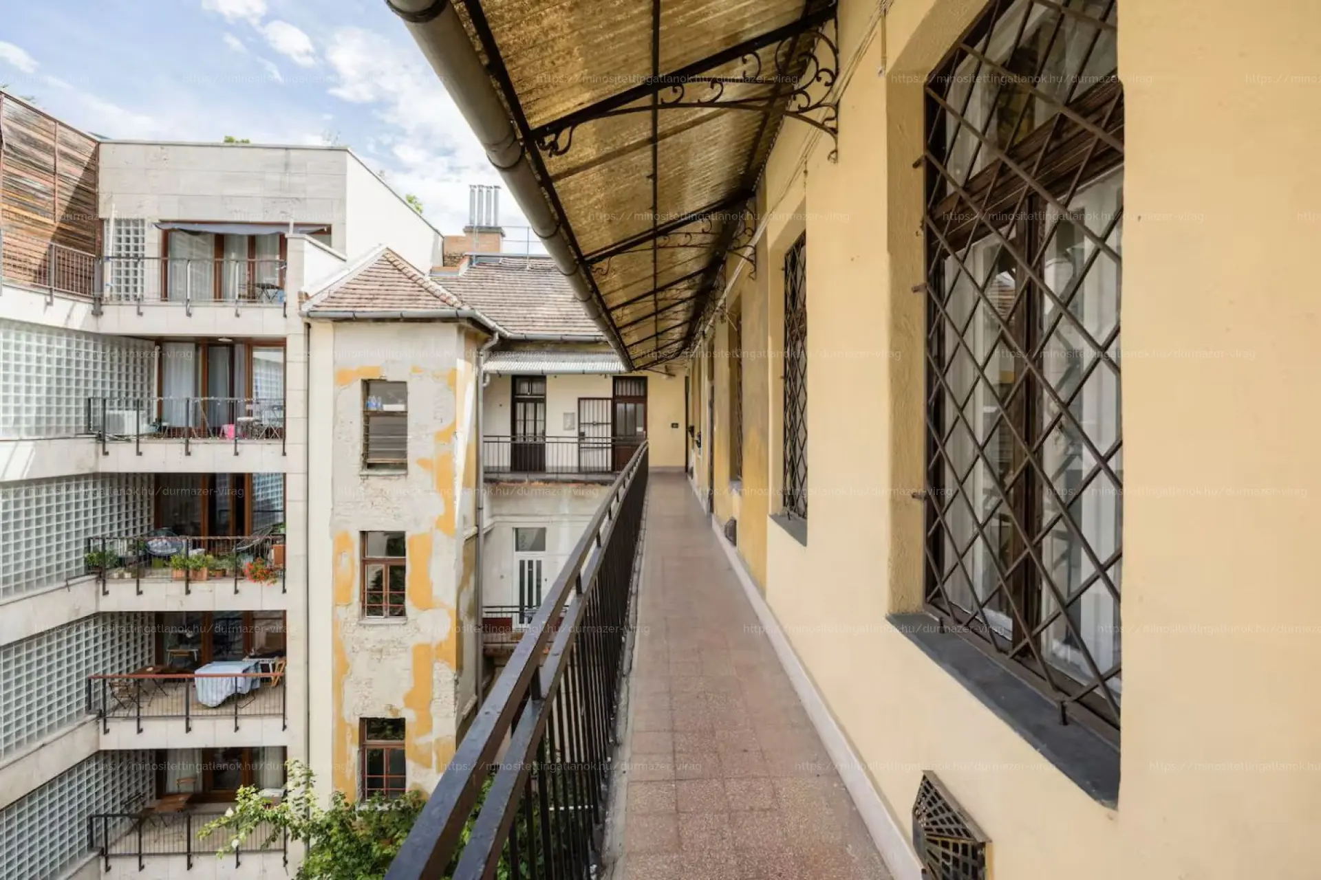 A körfolyosós kialakításnak köszönhetően minden ablak a belső udvarra néz, így a lakás kifejezetten nyugodt, annak ellenére, hogy Budapest egyik legpezsgőbb városrészében található.