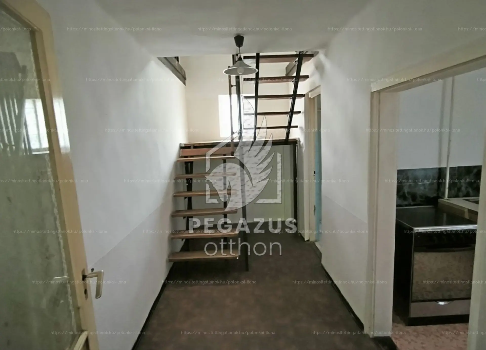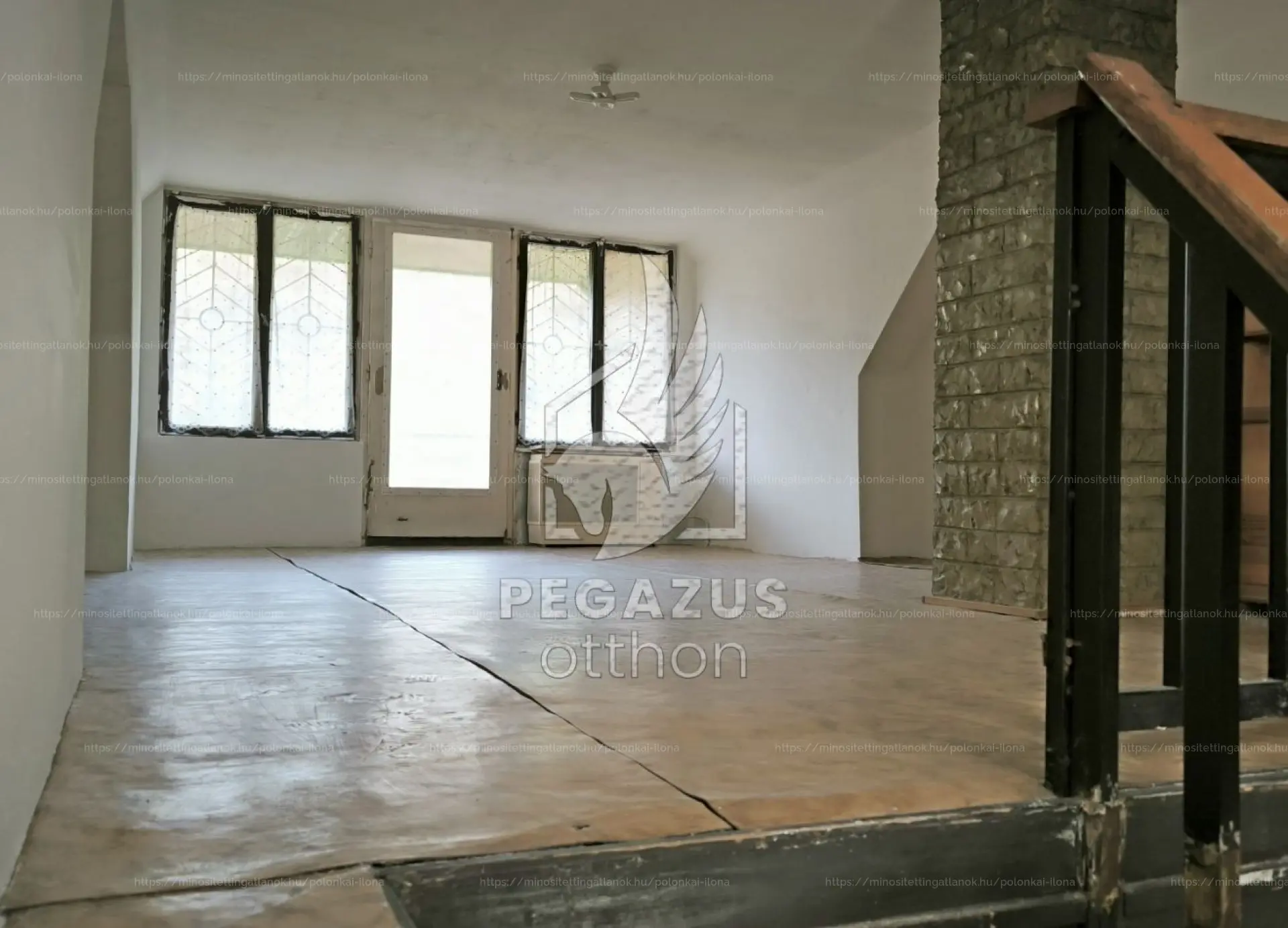 Alsó szint: Egy kisebb szoba, két nagyobb, összenyitható helyiség, konyha és egy felújítandó fürdőszoba.