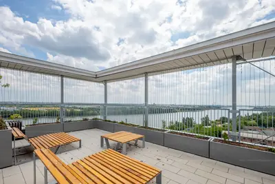 A 180°-os kilátás a Dunára és a budai hegyekre nyílik.