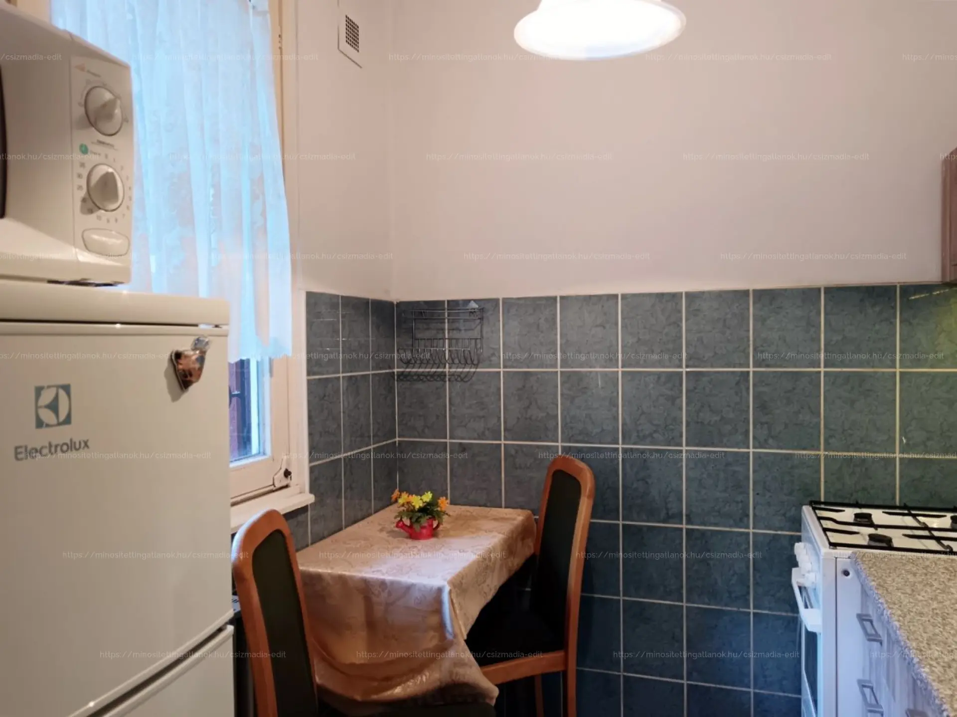* világos, ablakos konyha, amely a zárt belső parkra is néz, és asztalnak is van hely benne