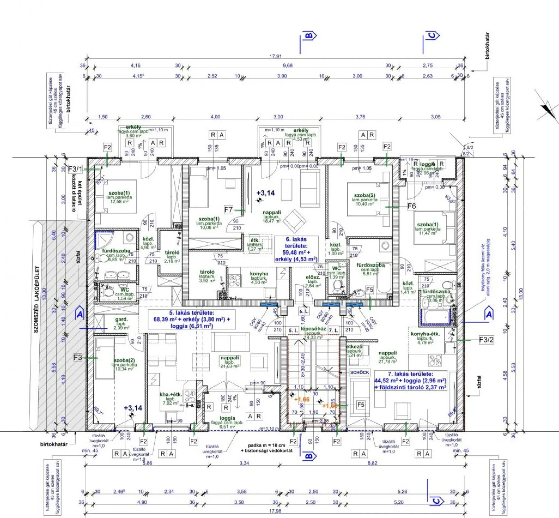 - Épületek: garázssor + 2 emelet + tetőtér beépítés.