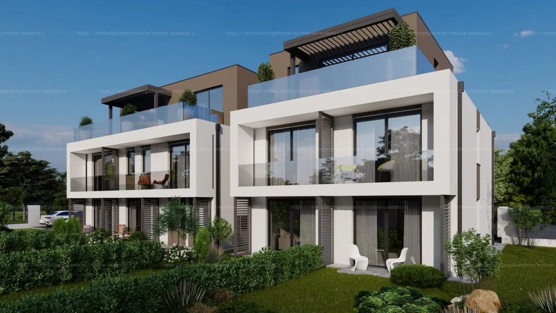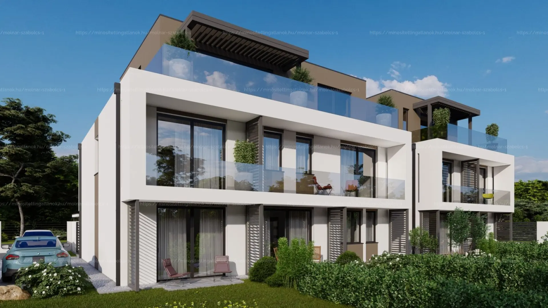 - Háromszintes kialakítás, a felső szinten tetőteraszos, zöldtetős megoldással.