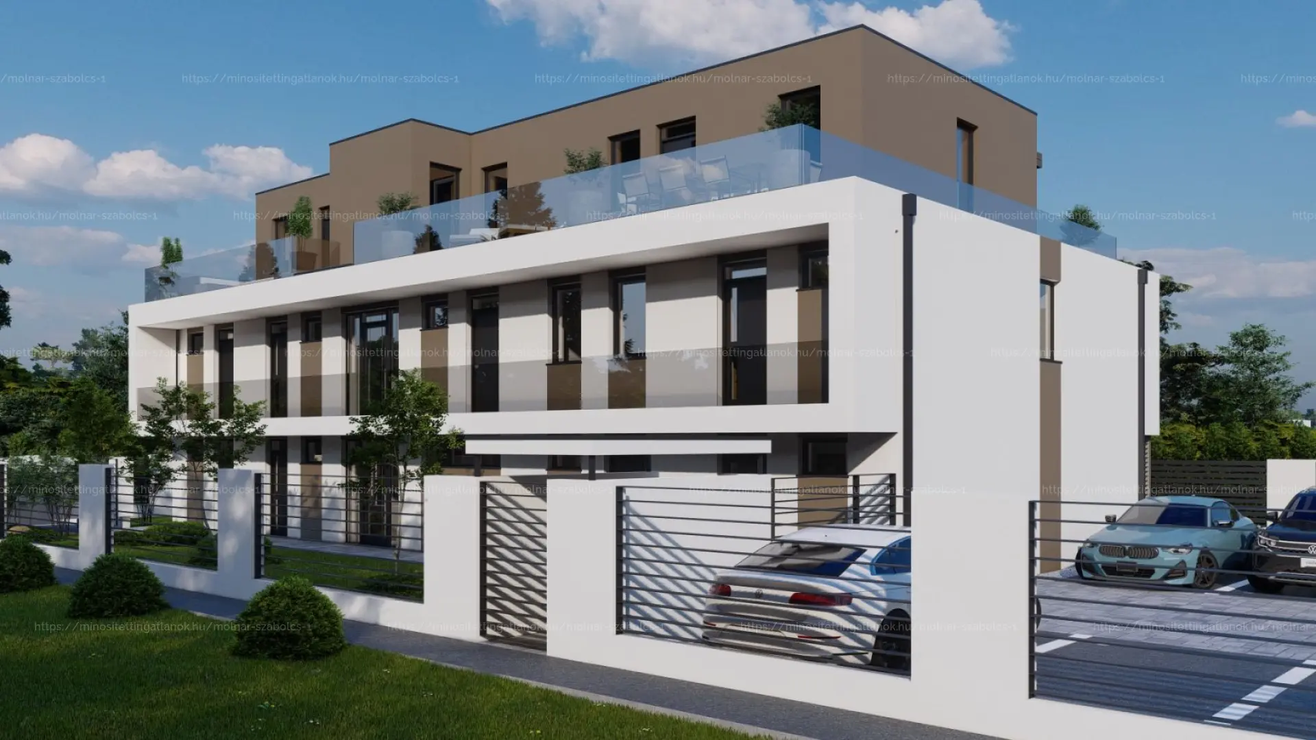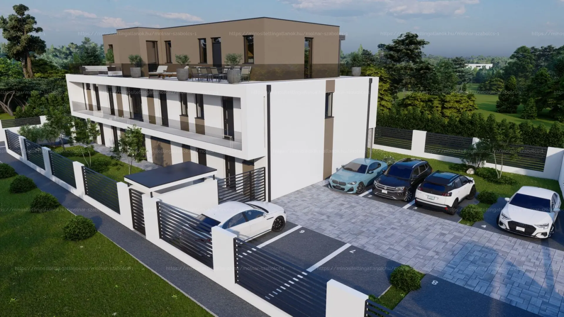 A látványtervben látható 10 lakásos, lakópark jellegű társasház építése engedélyezve.
