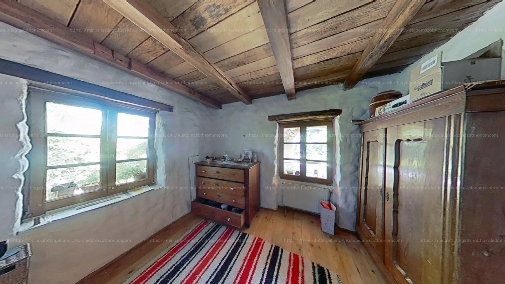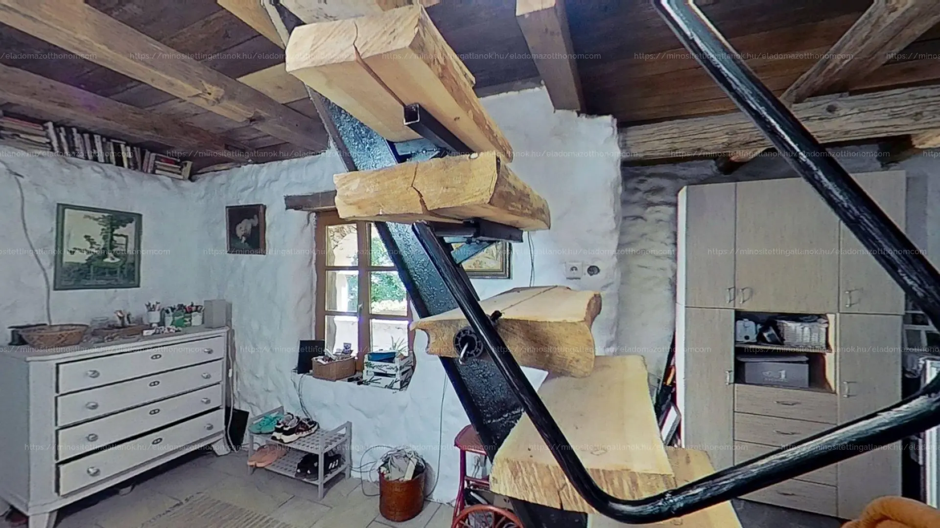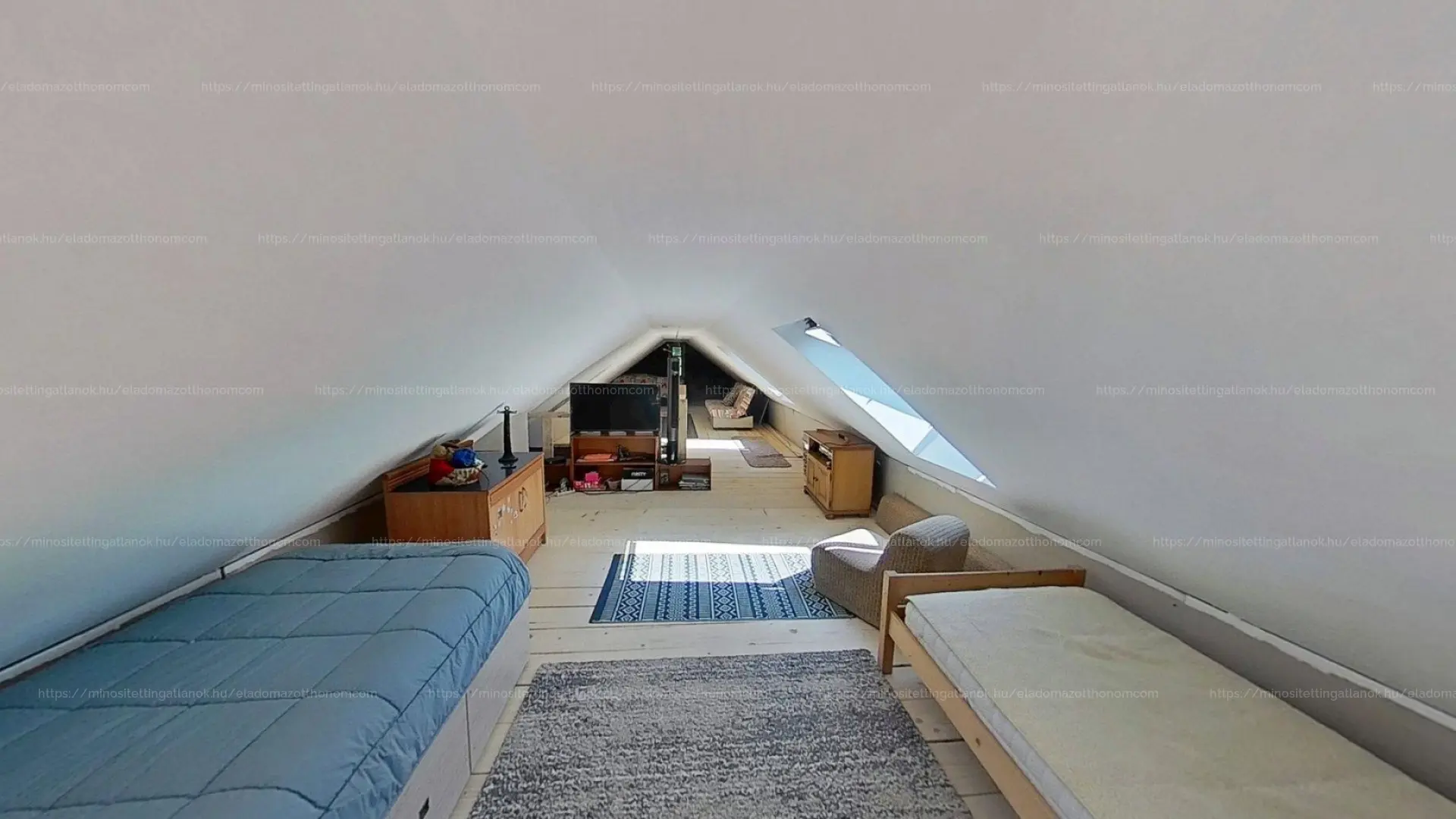 A tetőtér további egy 32,5 m2-es hálószobát foglal magába, mely egy légtér jelenleg, de igény szerint ketté osztható. A szinteket egyedi kézműves rönkfa lépcső köti össze.