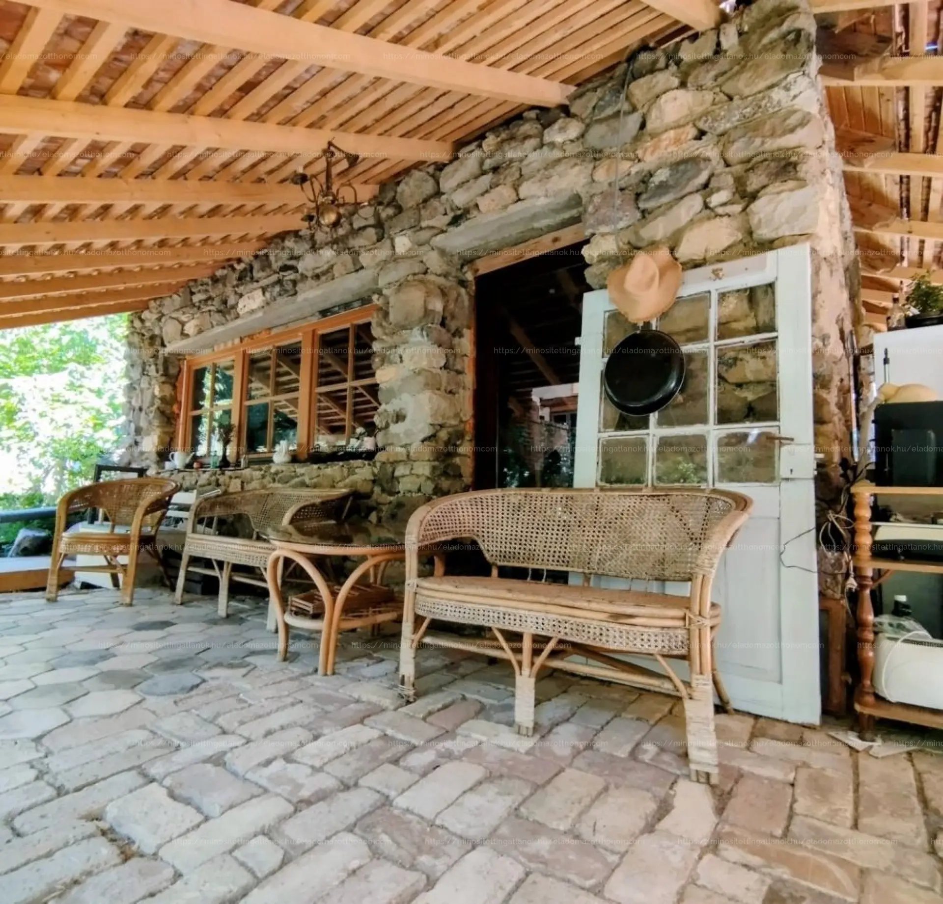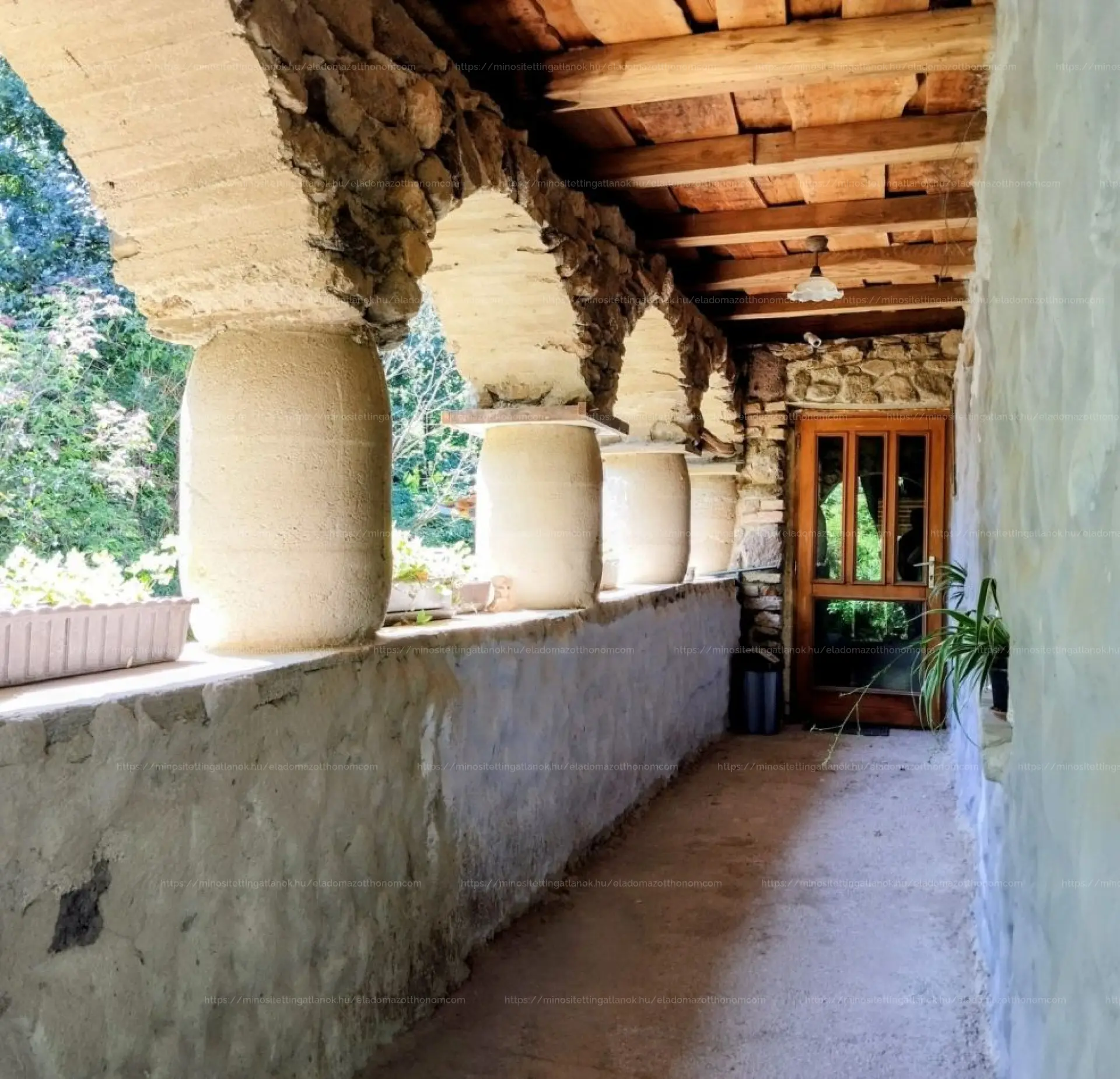 Alapozása betonalap, falai 55 cm-es kőfalak, dupla hőszigetelt fa nyílászárókkal, természetre tekintő nagy üvegfelületekkel a földszinten, ahol egy tágas, amerikai konyhás nappali-étkező, fürdőszoba és hálószoba került kialakításra. Két bejárata van a háznak, az utca felől egy 12,5 m2-es tornácos, fedett terasz, a patak felől egy félig fedett 30 m2-es hátsó terasz került kialakításra.