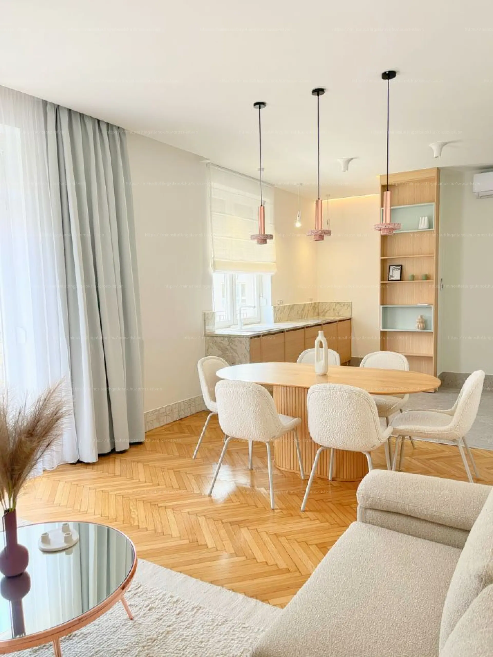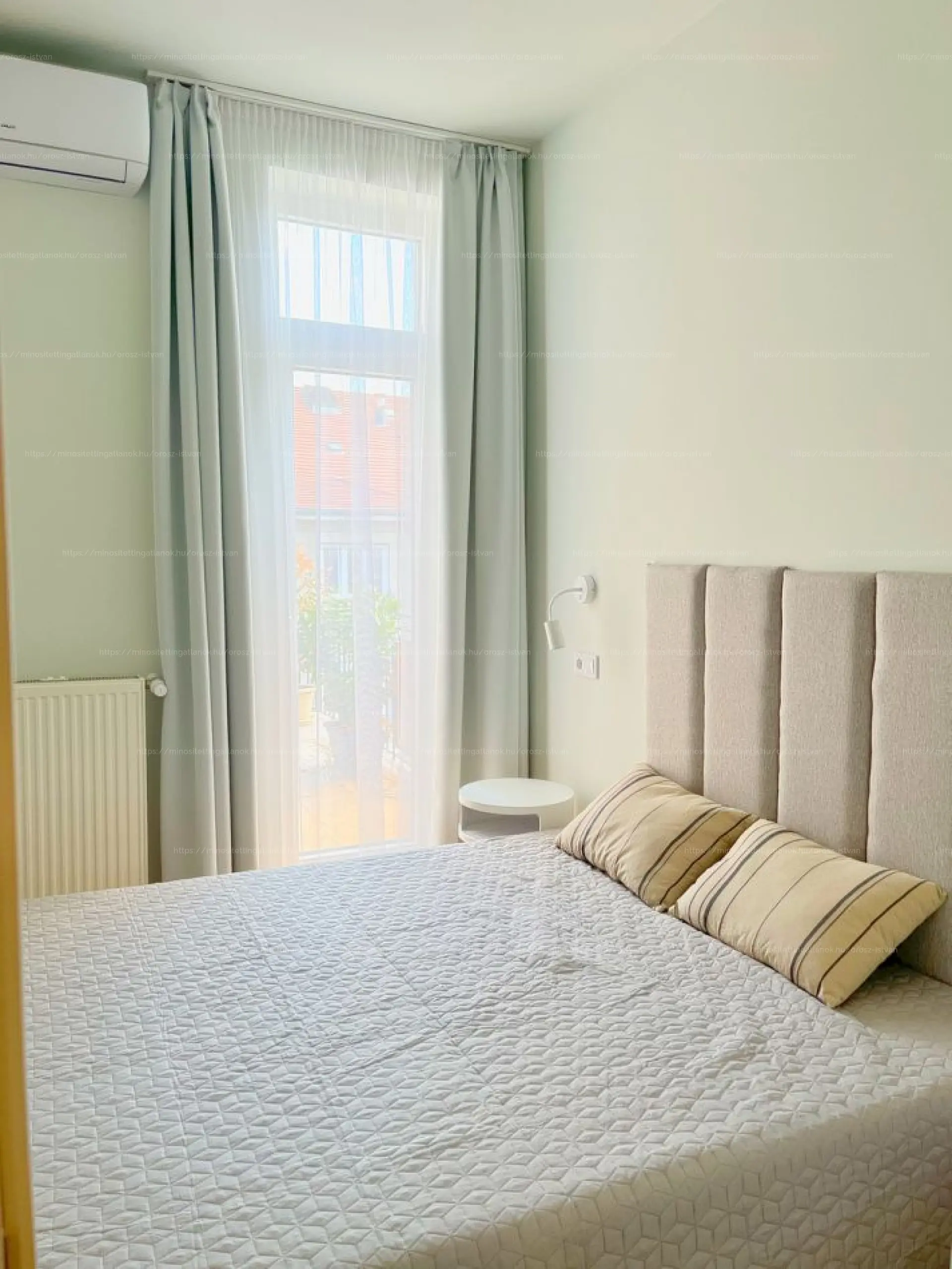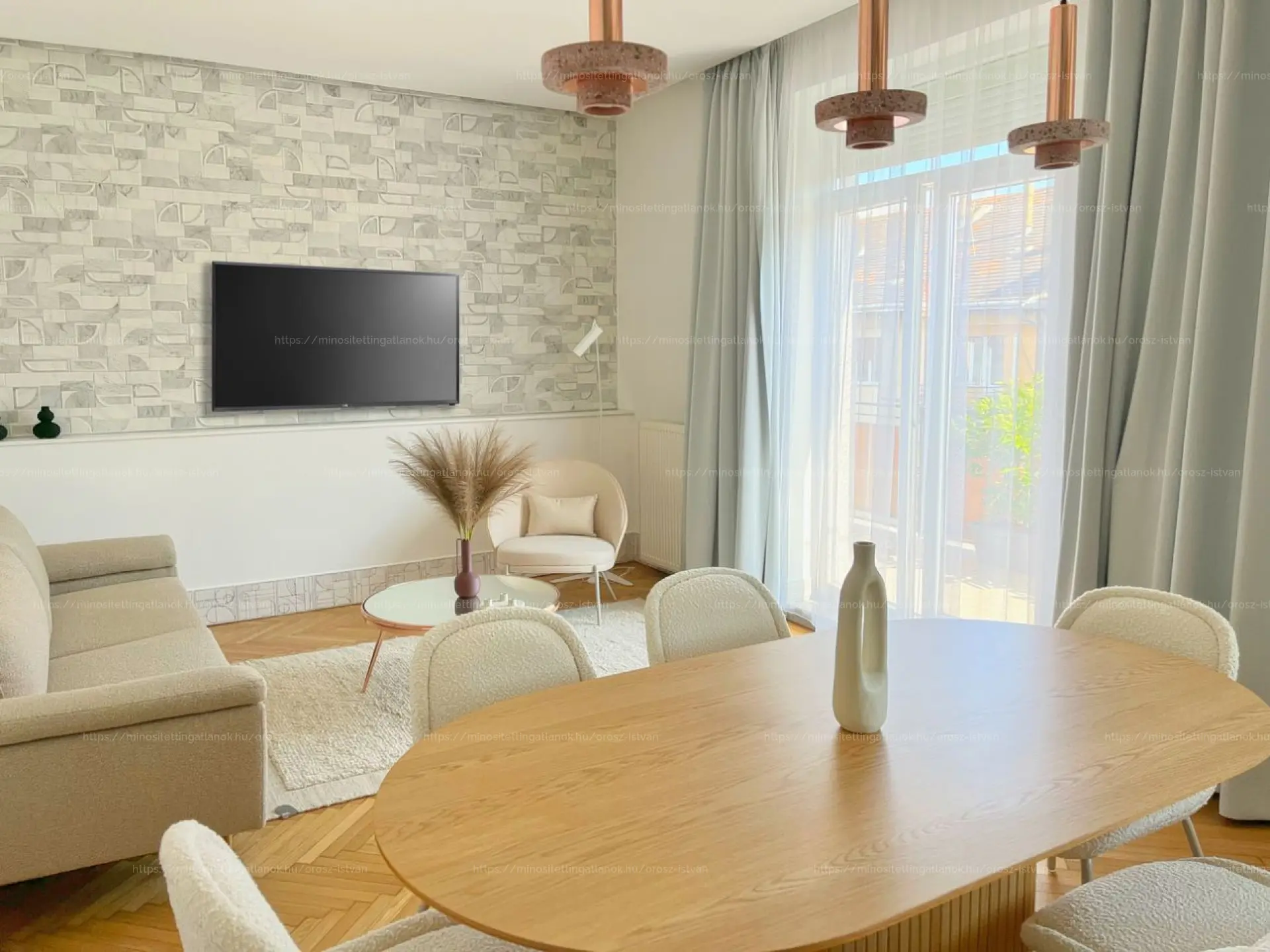 A lakás belsőépítész tervei alapján került felújításra és átalakításra. A nappali és a konyha-étkező egy tágas légtérben található, dupla erkélyajtóval a teraszra. A hálószobából szintén van kijárat a teraszra. Külön vendég WC helyiség került kialakításra.