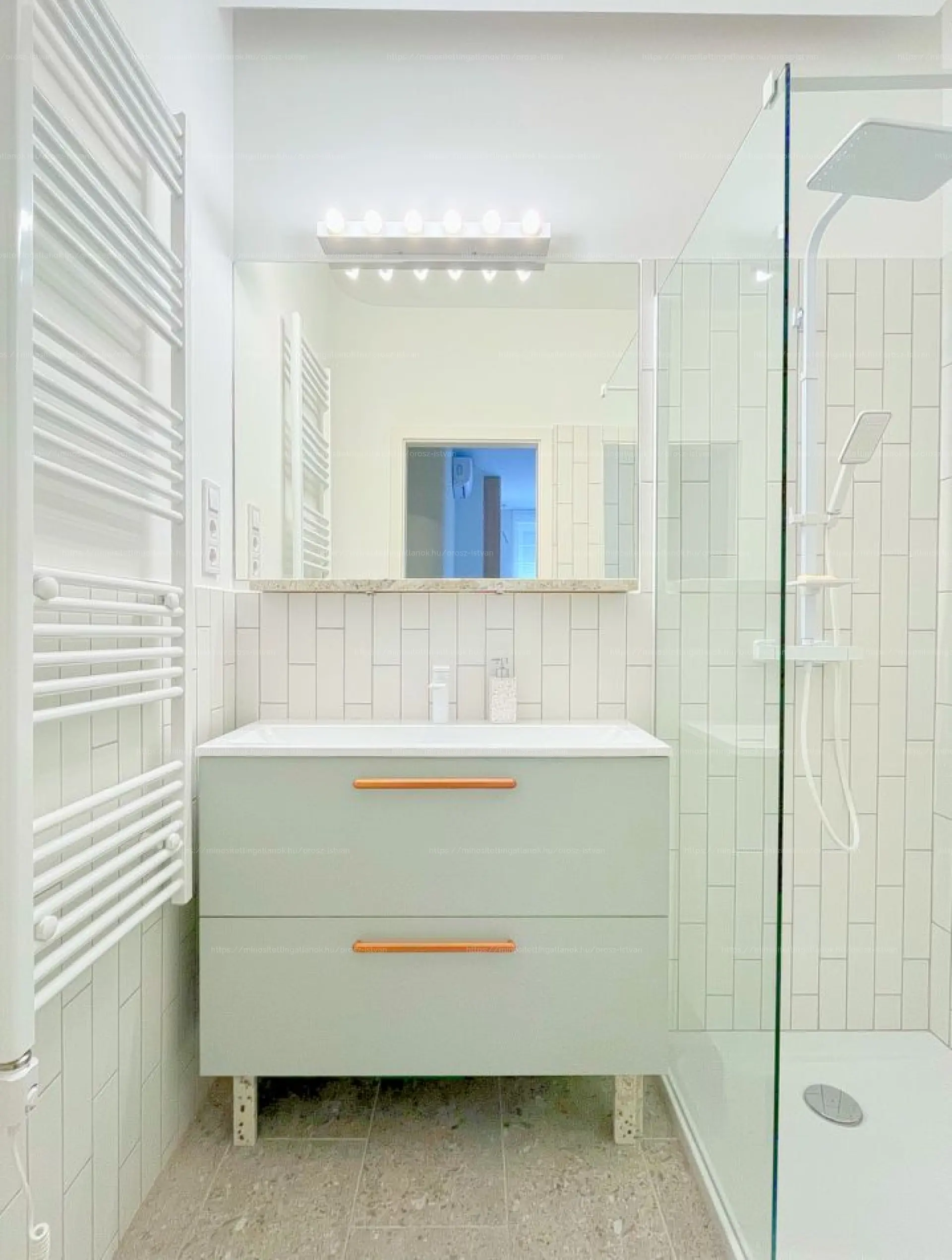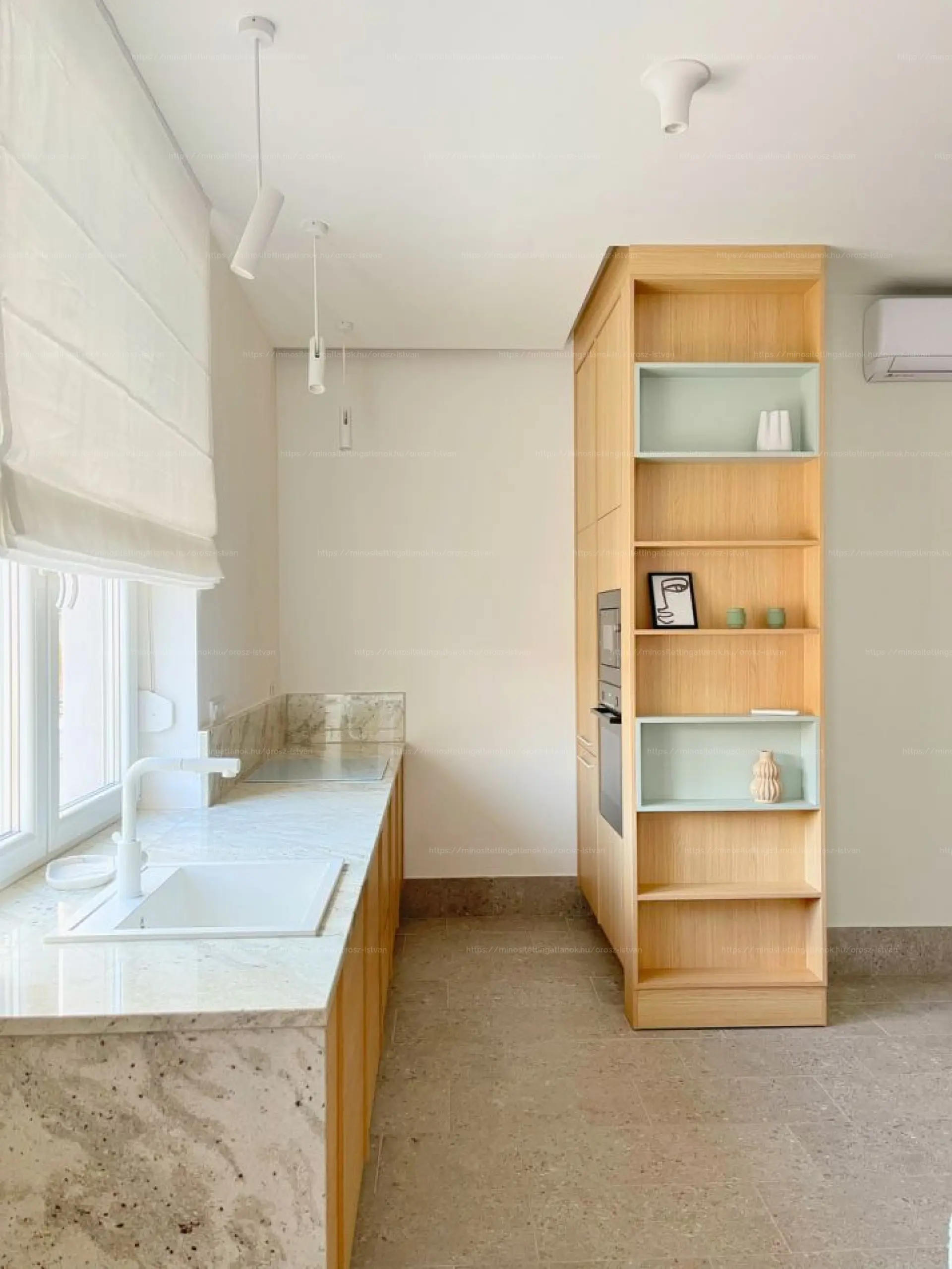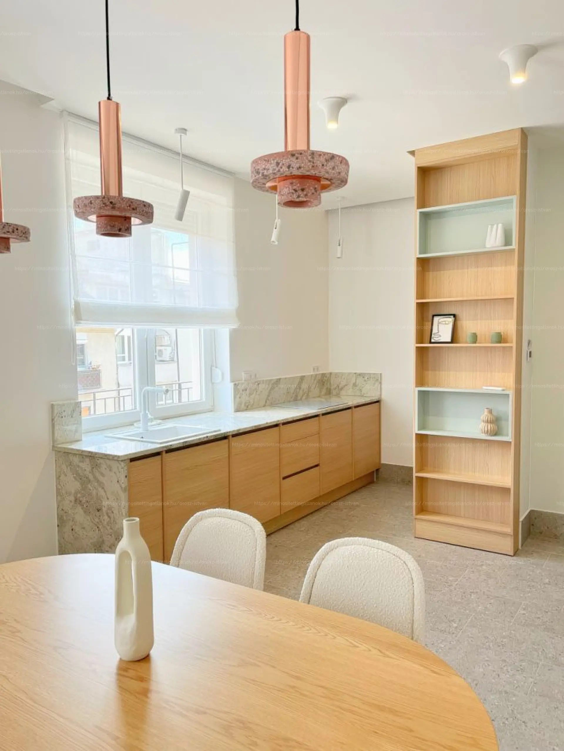 A lakás belsőépítész tervei alapján került felújításra és átalakításra. A nappali és a konyha-étkező egy tágas légtérben található, dupla erkélyajtóval a teraszra. A hálószobából szintén van kijárat a teraszra. Külön vendég WC helyiség került kialakításra.