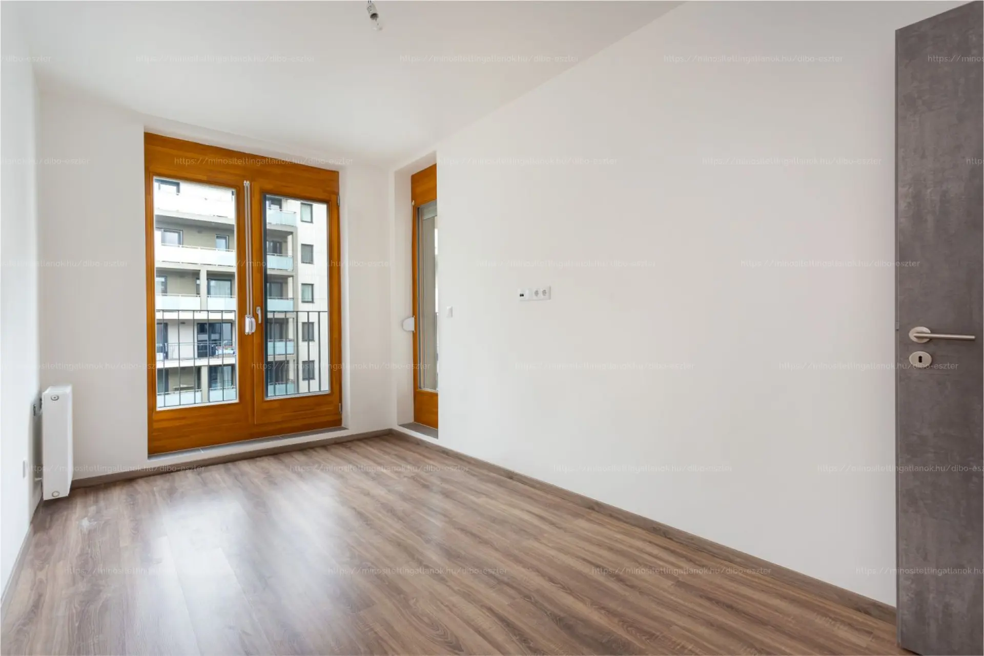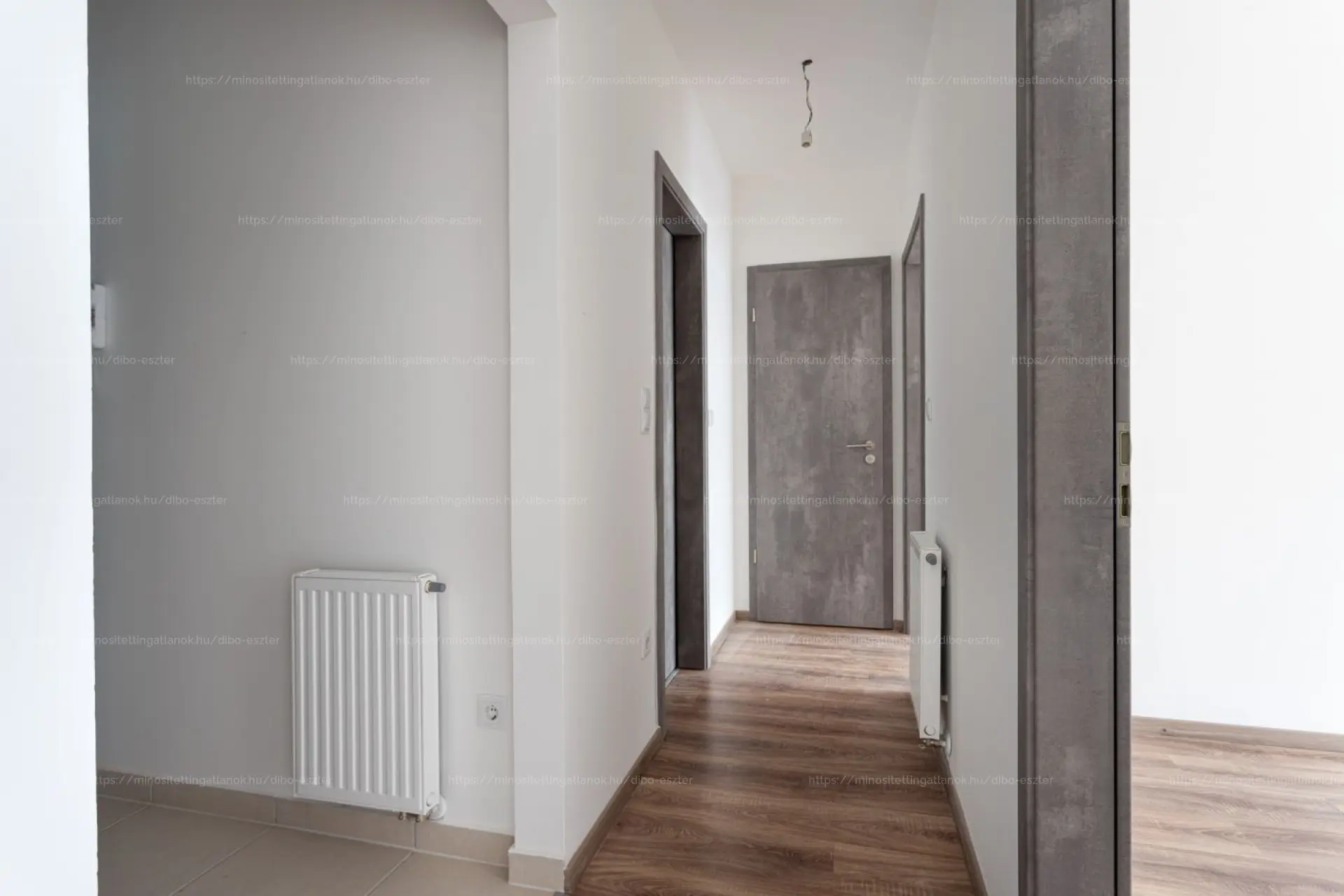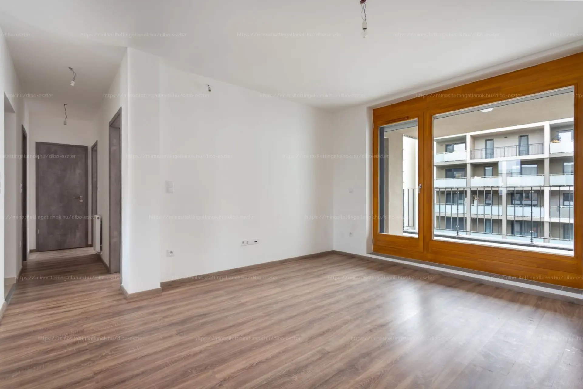 A bejáratnál biztonsági ajtón jutunk be a tágas előszobába, ahol kényelmesen elférnek az előszobabútorok, cipők, kabátok. Innen egy közlekedőn át vezet az út a nappaliba, illetve a hálószobákhoz. A nappali nagy üvegfelülettel nyílik a terasz felé, fa nyílászárókkal. A nappalihoz ablakos amerikai konyha tartozik, így a konyha is kap természetes fényt. A konyha mellett külön háztartási helyiség/tároló kapott helyet.