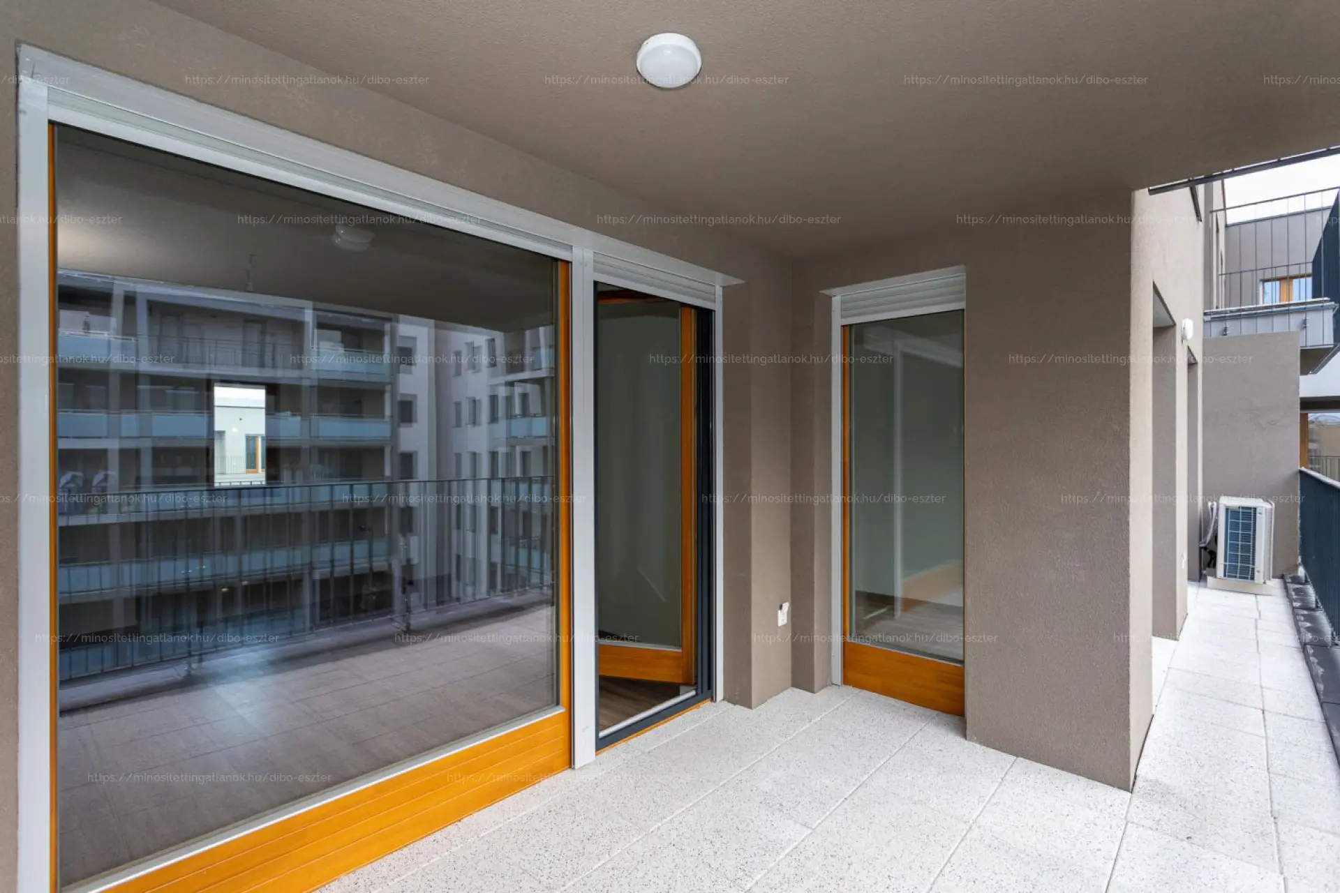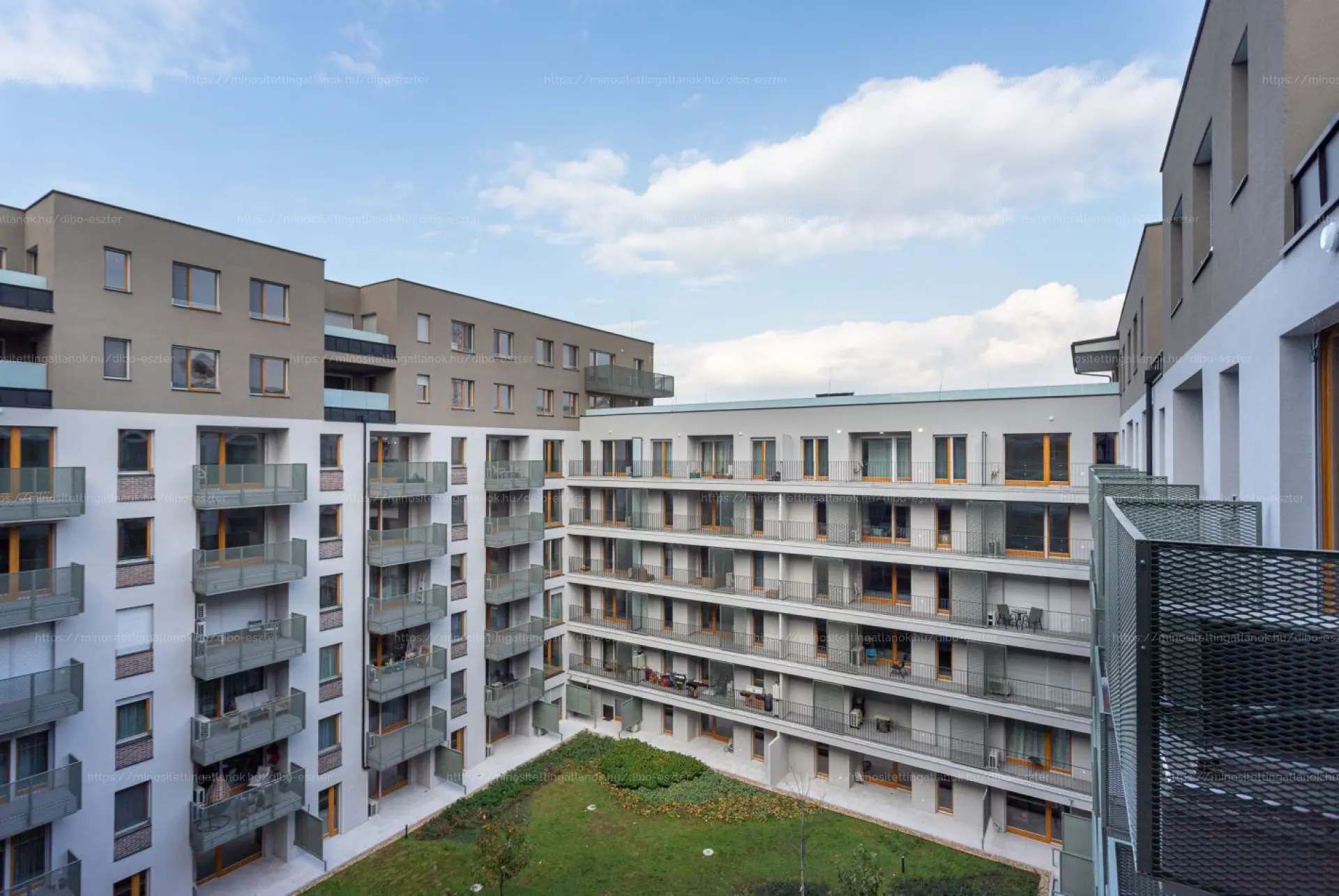 A 16 m²-es, részben fedett terasz a lakópark belső udvarára néz.