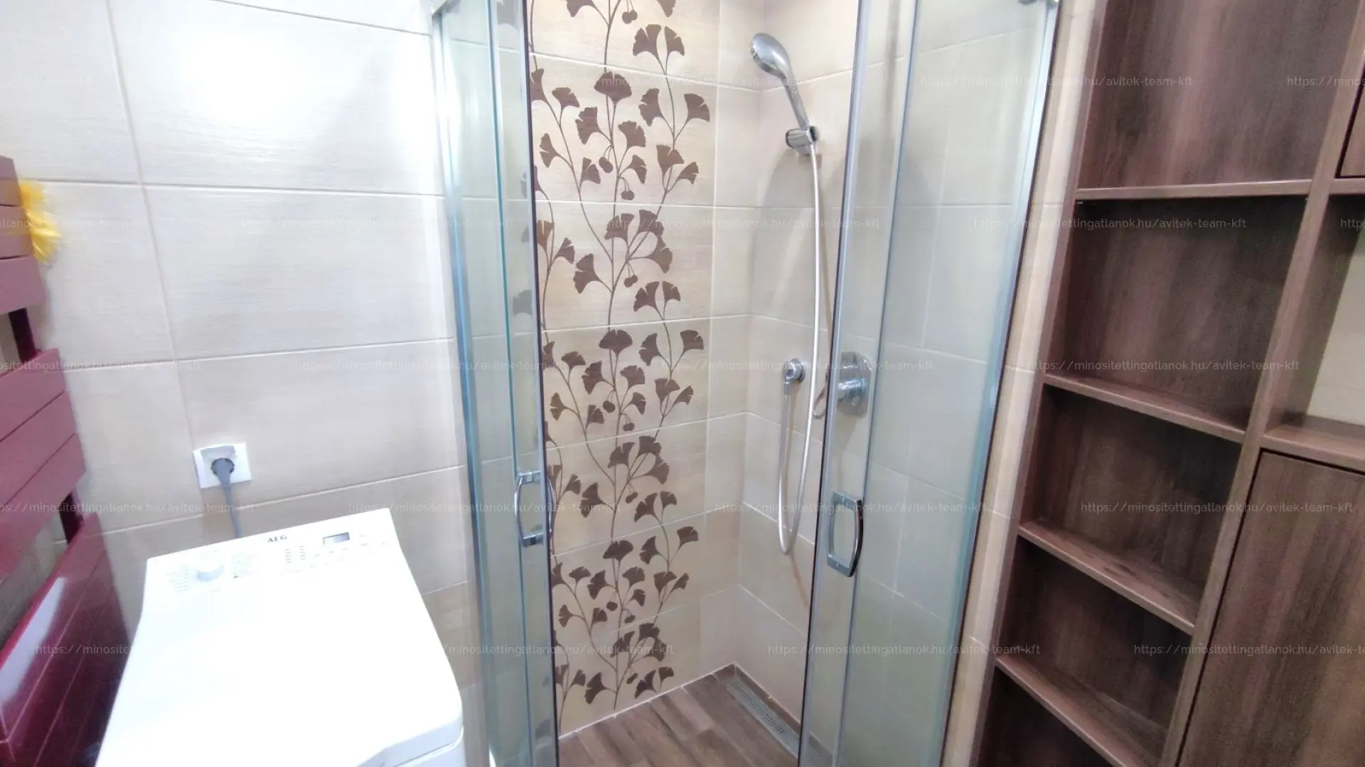 A fürdőszobában mosdó, zuhany, wc és mosógép található.