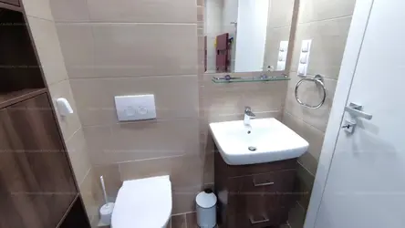 A fürdőszobában mosdó, zuhany, wc és mosógép található.