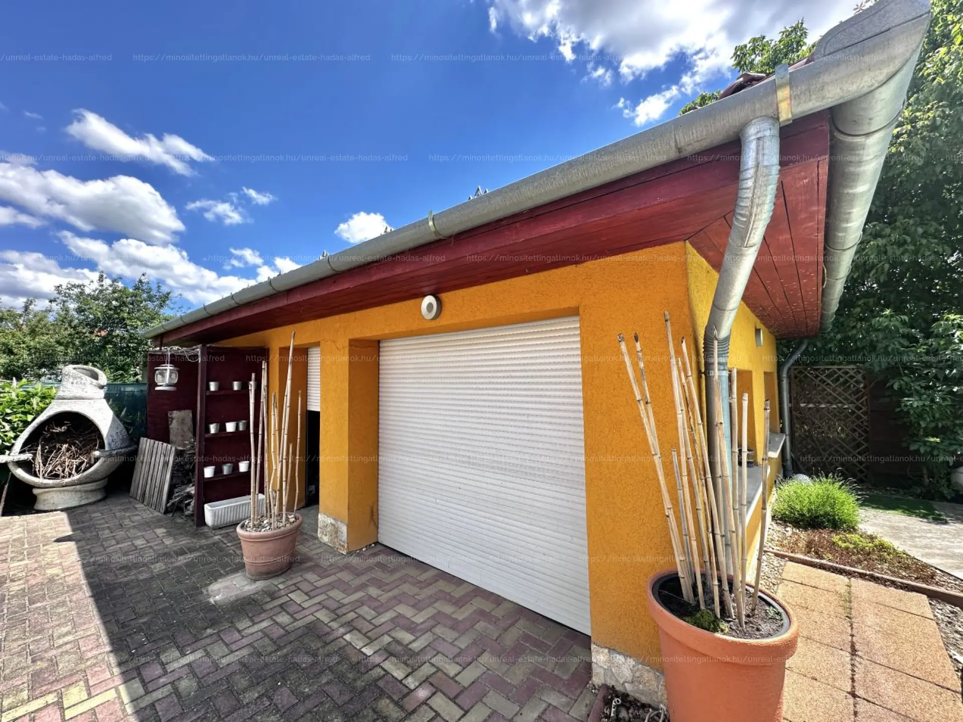 Az 583 m²-es telek elektromos kapuval, garázzsal (padlástérrel), több autóbeállóval és gondozott kerttel rendelkezik.