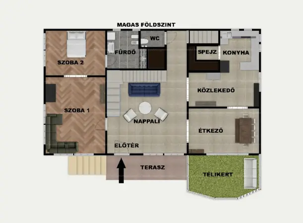 A télikert közvetlenül a teraszhoz és az ebédlőhöz kapcsolódik.