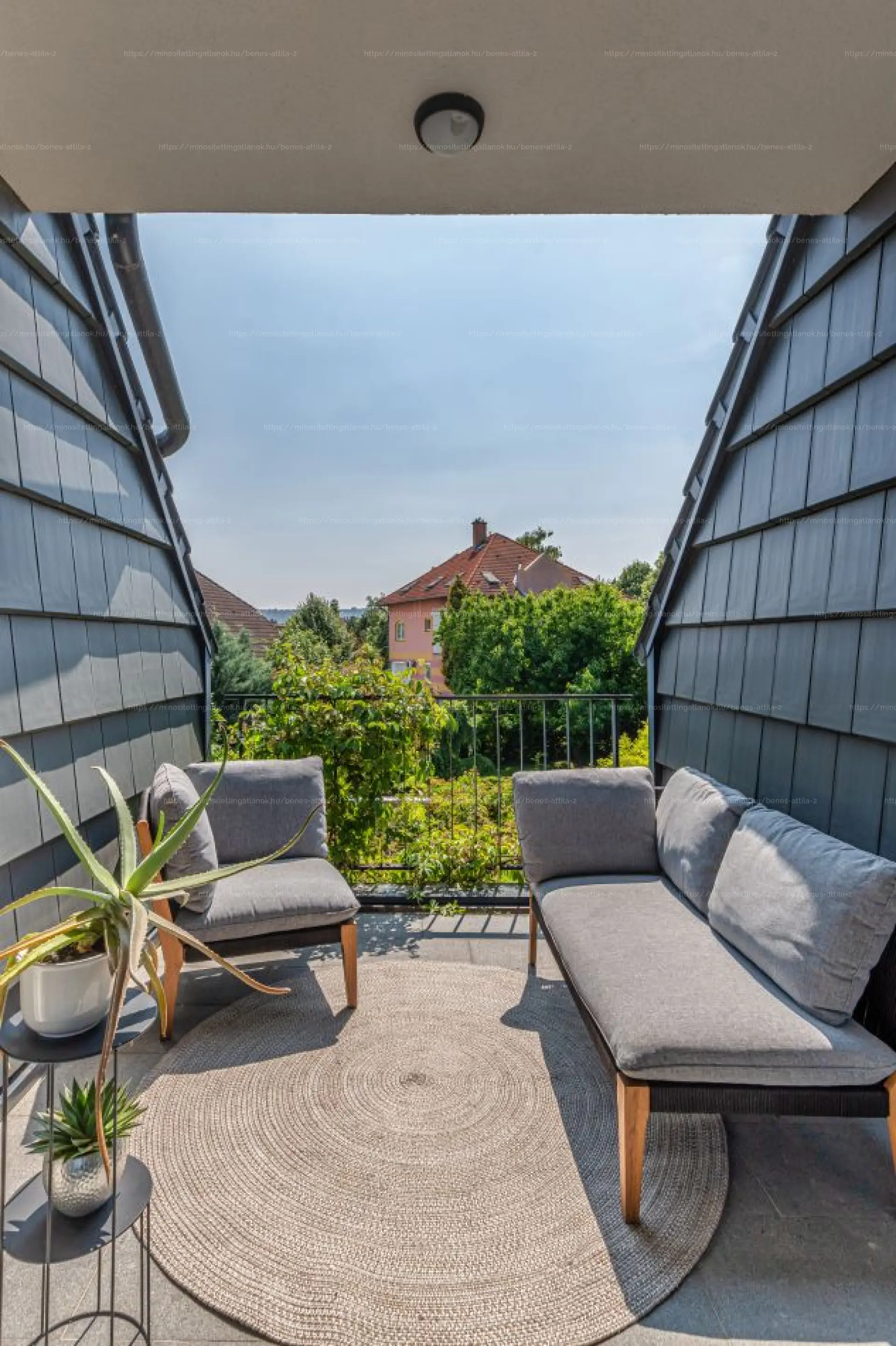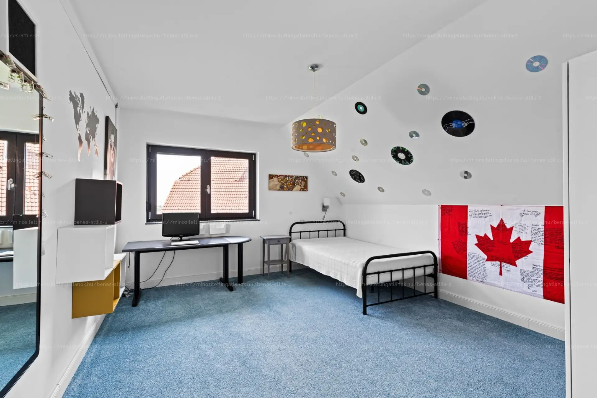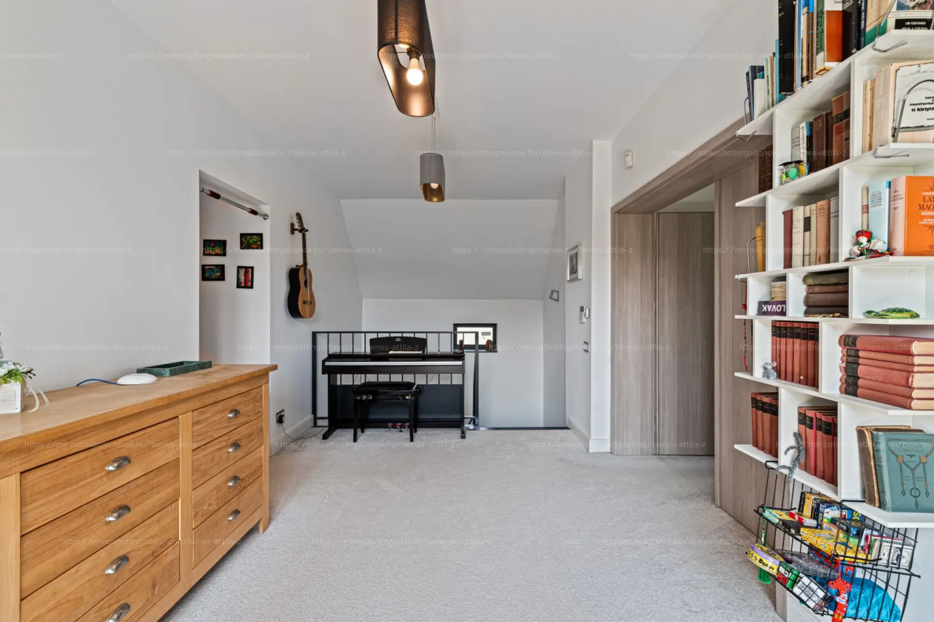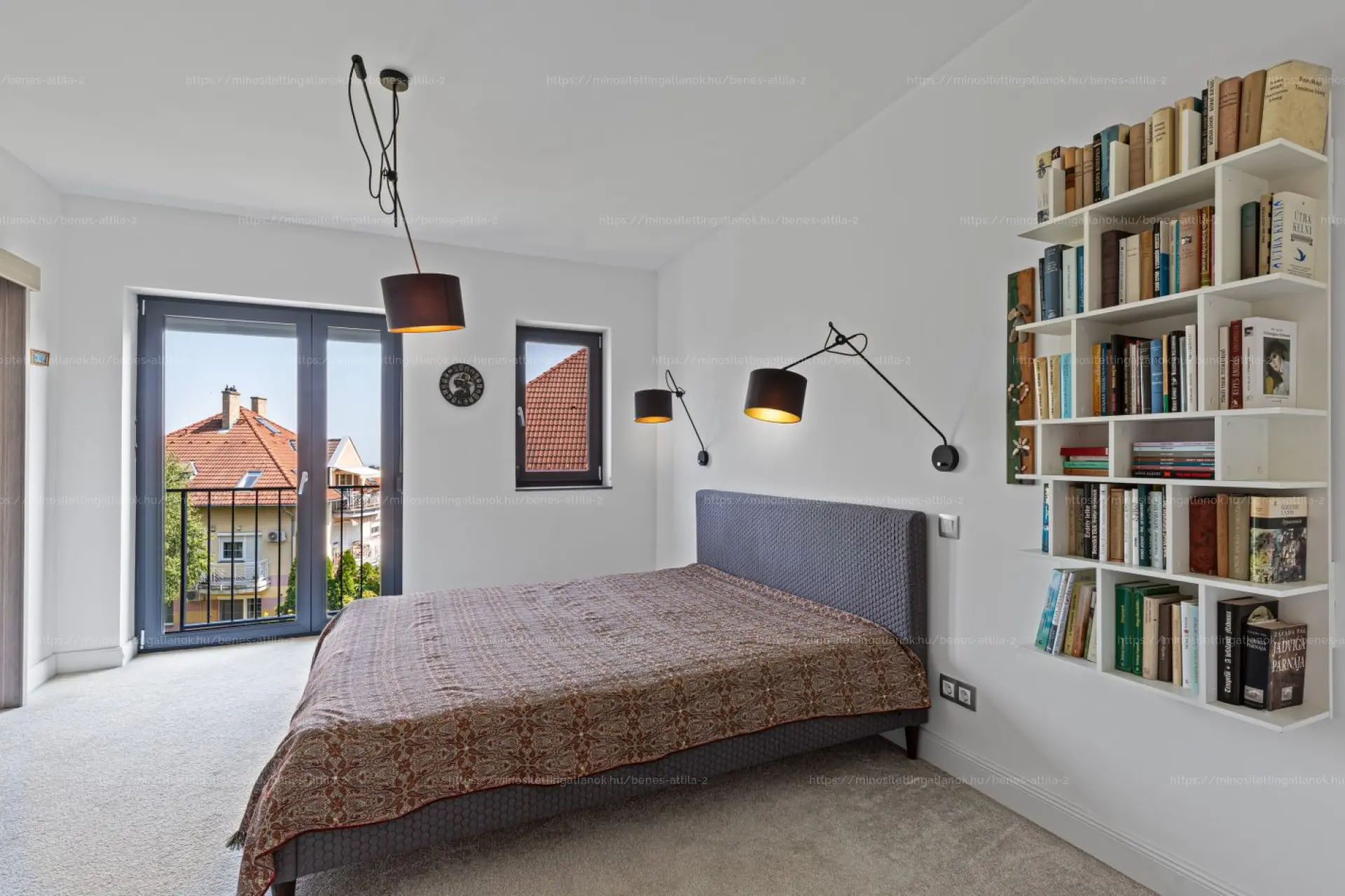 Az emeleti szinteken kerültek kialakításra a tágas hálószobák és a hozzájuk tartozó fürdőszobák, gardrób, mosókonyha, a szülői háló pedig saját fürdővel és gardróbbal rendelkezik, erről és a felette lévő tetőtéri szintről szép panoráma nyílik a városra.