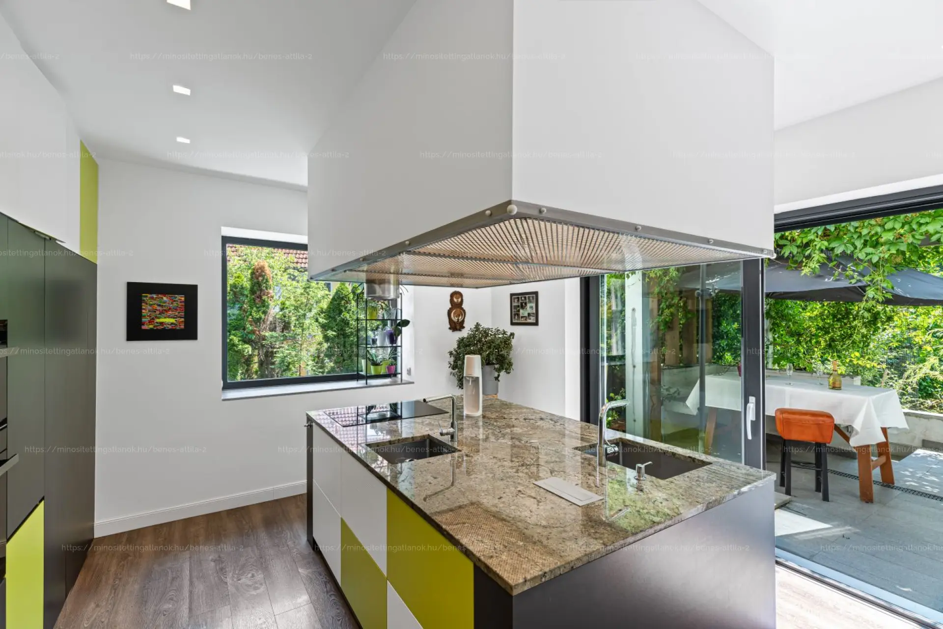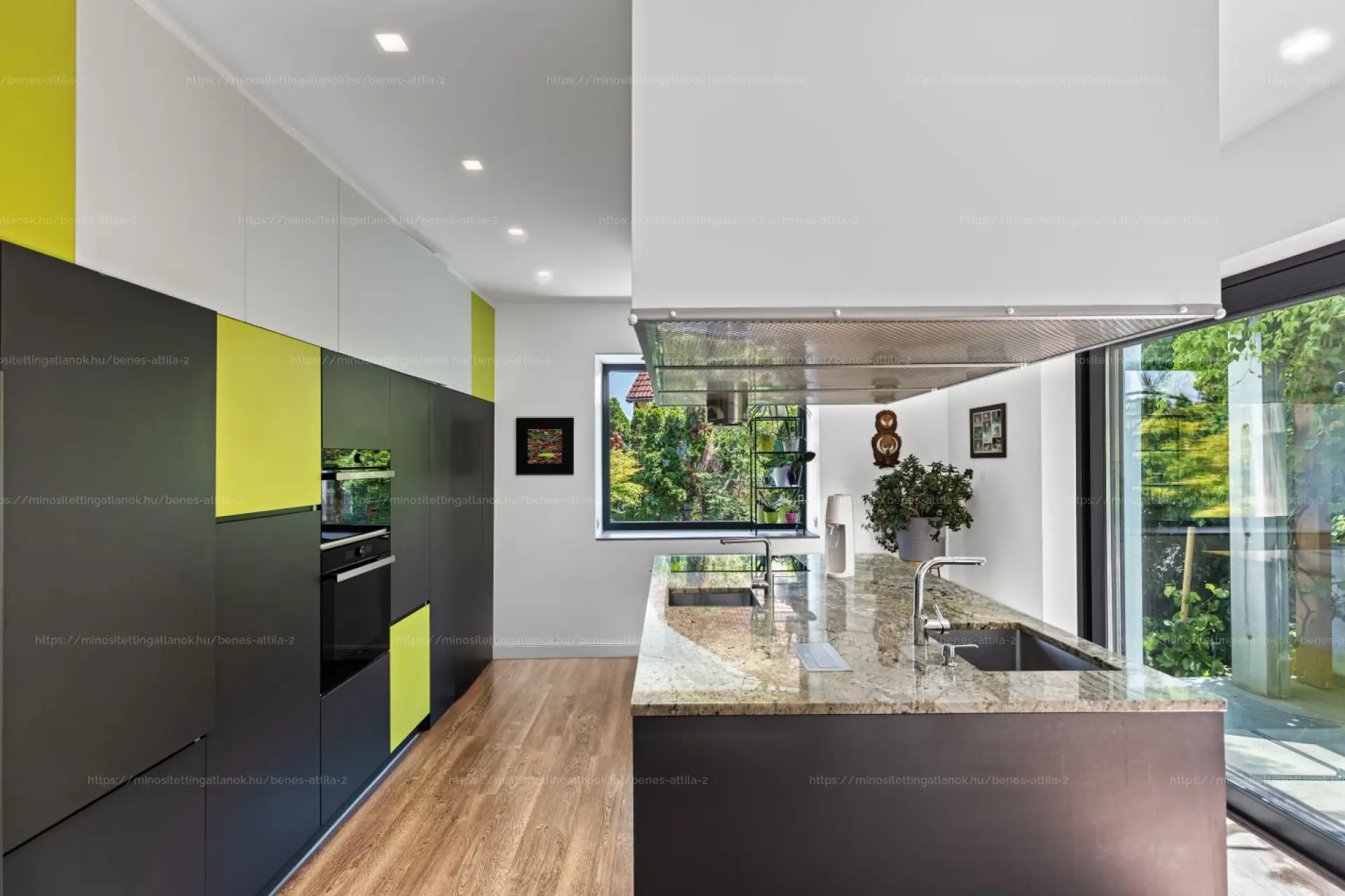 A családi ház földszintjén helyezkedik el a tágas nappali, étkező, konyha hármasa, melyek közvetlenül kapcsolódnak egy zöld növényzettel árnyassá varázsolt, körülbelül 25 négyzetméteres teraszhoz, ami remek helyszínül szolgál családi, baráti összejövetelekhez, grillezéshez, hangulatos ebédekhez, vacsorákhoz. A családi konyha minőségi gépekkel felszerelt, sok tárolási lehetőséget rejt, hatalmas főző szigete gránit pulttal borított. Az étkezőben kandalló varázsolja meghitté a téli estéket. Ezen a szinten található továbbá egy dolgozónak vagy vendégszobának használható helyiség, fürdővel.
