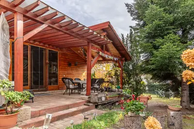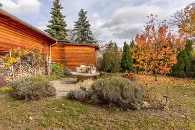 A kert rendezett, nagy fedett terasszal és szalonnasütő-bográcsozóval – remek hely családi eseményekhez! A garázs egy autós, a beálló két kocsit fogad. 🚗