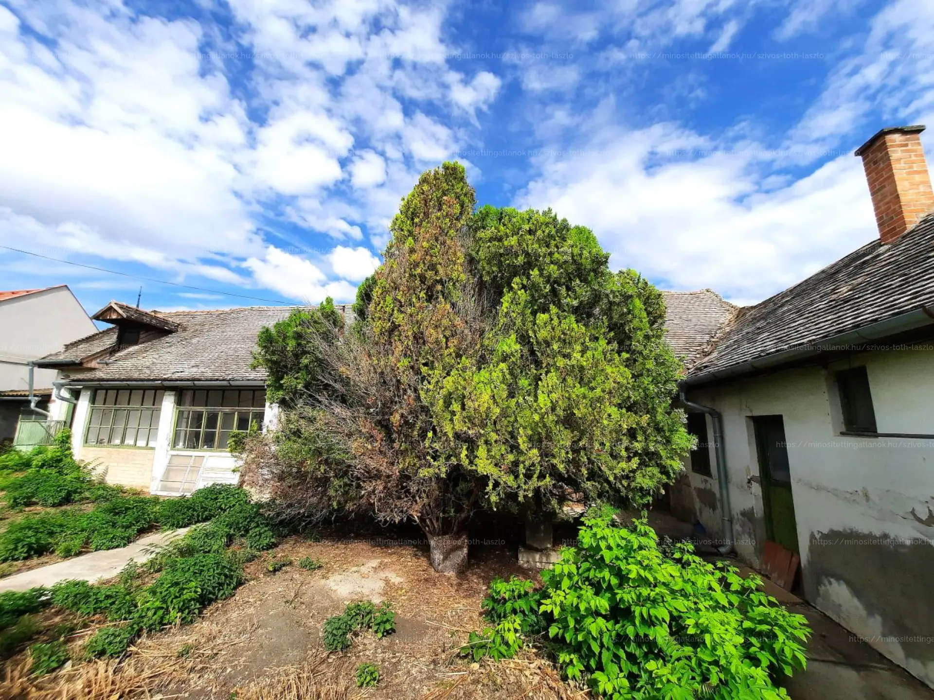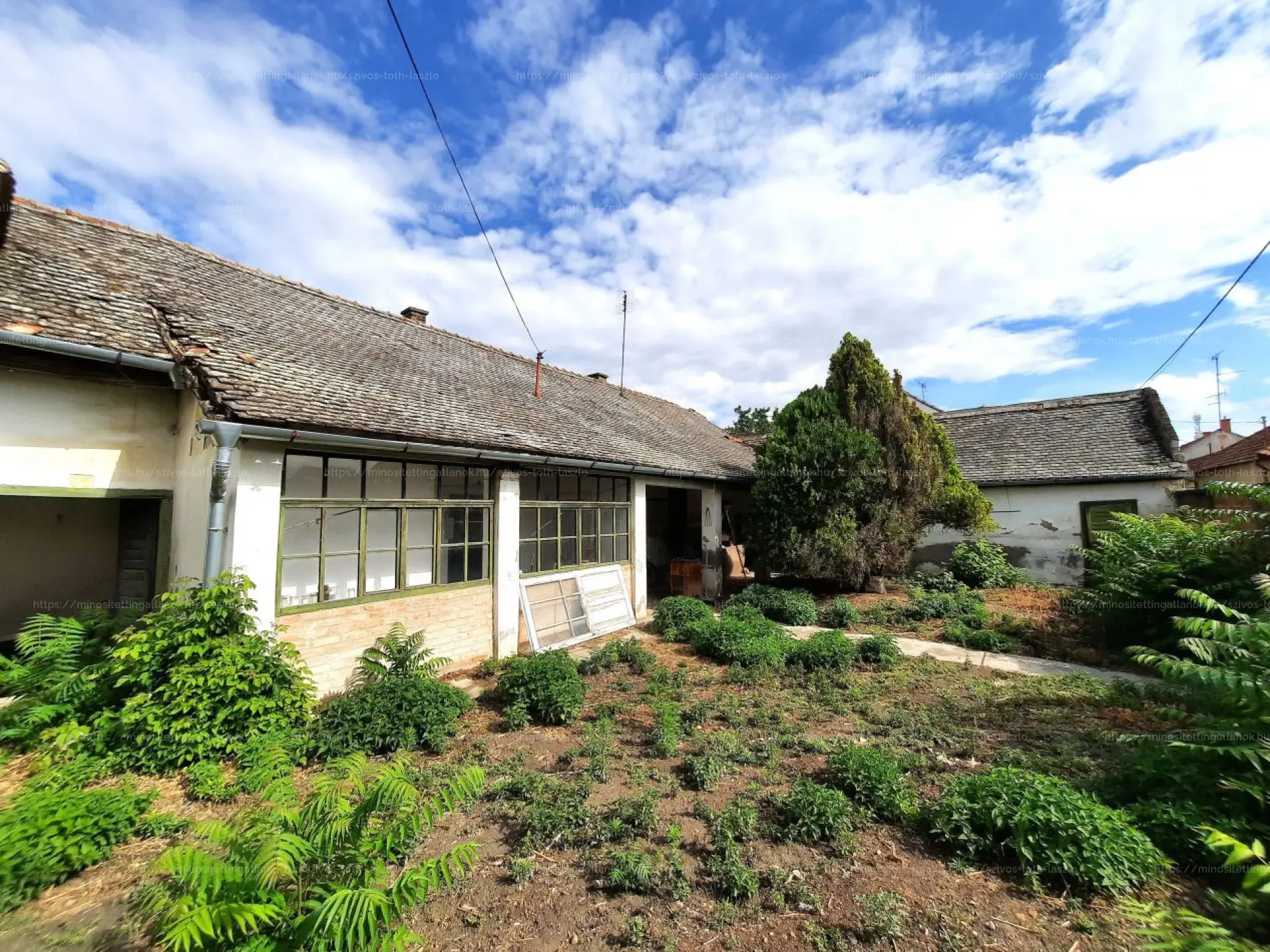 Az 1970-es években épült, vegyes falazatú ingatlan a város központjában, csendes utcában, két perc sétára fekszik a főtértől. A ház négy szobából, egy konyhából, egy fürdőszoba-WC-helyiségből, egy különálló WC-helyiségből, egy előszobából, kettő tárolóból, egy teraszból, egy pincéből és egy garázsból áll. A közművekből a telken belül a villany- (1x16A ), a vezetékes víz-ellátás és a csatorna áll rendelkezésre. A gáz az utcában található. A kert locsolása saját fúrt kútról házi vízművel megoldott.