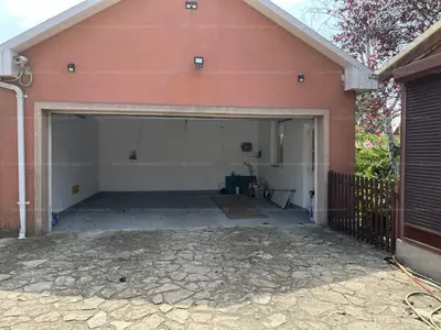 A telken egy 30 m²-es, téglaépítésű, szerelőaknás, elektromos kapuval ellátott garázs is található, amely két autó kényelmes elhelyezését biztosítja.