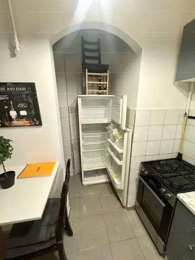 The apartment was freshly renovated one year ago — walls repainted, interior doors renewed, and the parquet floor sanded and refinished.