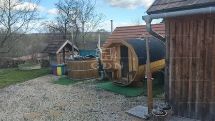 Az udvar kert felőli részén, szemben a fedett terasszal található egy fatüzelésű 6 személyes DÉZSAFÜRDŐ, illetve egy 6 személyes hordó SZAUNA.