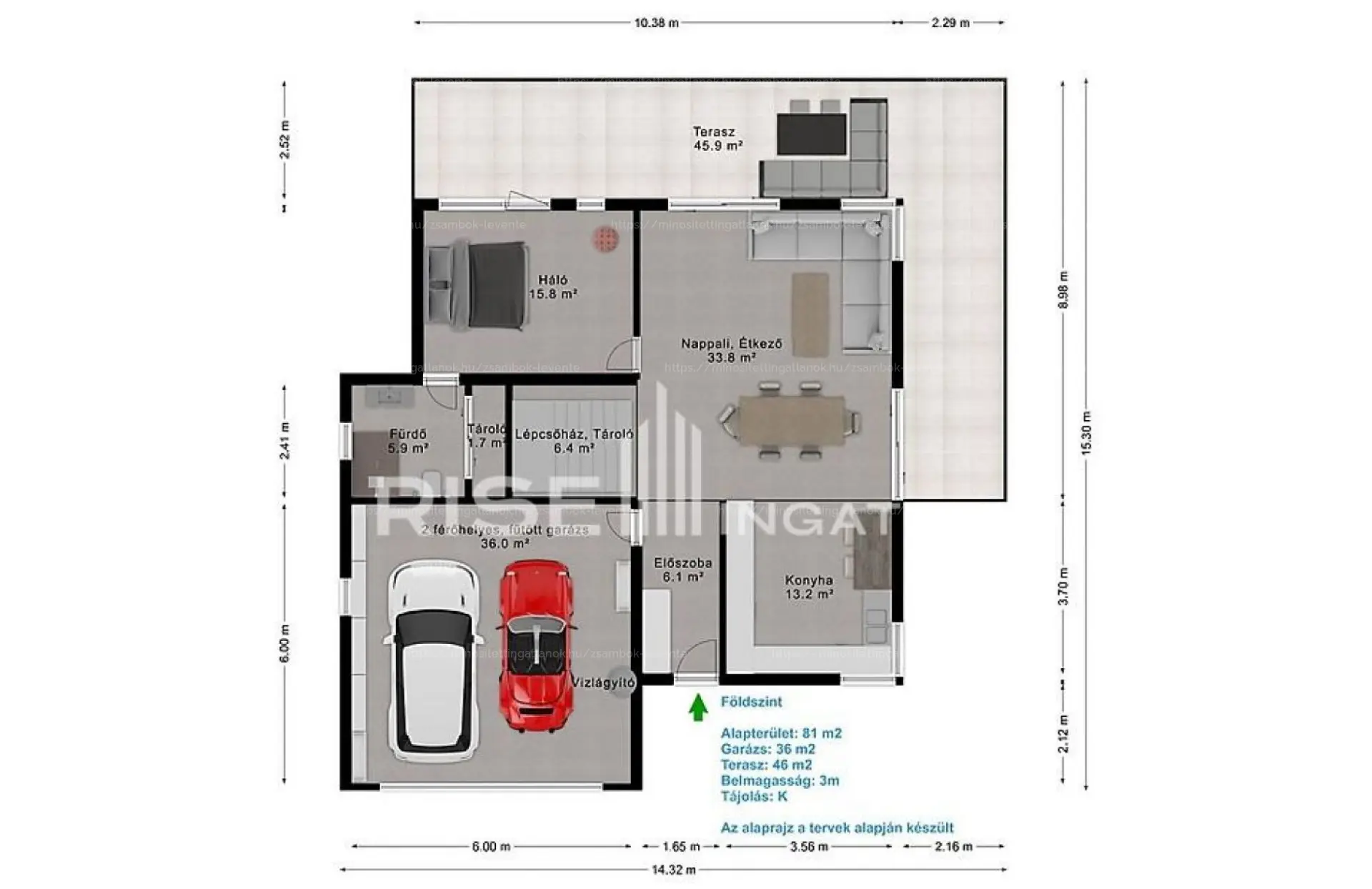 A 6x 6 méteres garázs két jármű számára kényelmesen parkolható, továbbá plusz tárhelyet biztosít a teljes hosszában plafonig beépített polcrendszer.