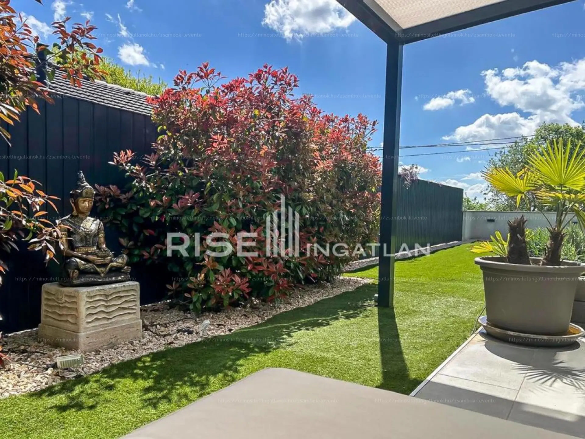 A modern megjelenésű családi ház 2020–ban épült egy 537 m2-es telekre, amit mára már szépen megnőtt bokrok, dísznövények tarkítanak. A kertet csepegtetőrendszer tartja frissen.