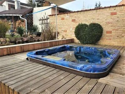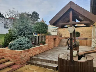 646 nm parkosított kert veszi körbe a házat, a nappaliból közvetlen érjük el a nyitott teraszt, ahol süllyesztett jacuzzi is található.
