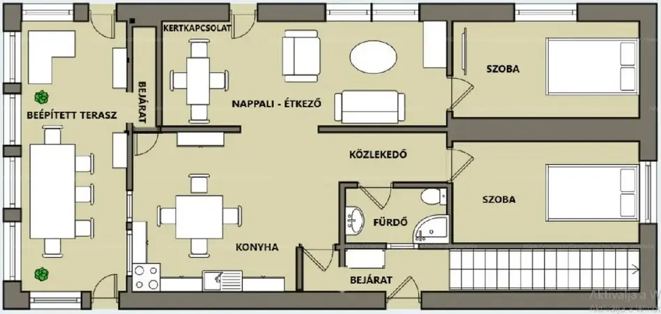 Mindkét szinten nappali-konyha-étkező, fürdőszoba, közlekedő és 2 hálószoba került kialakításra.