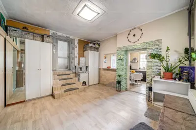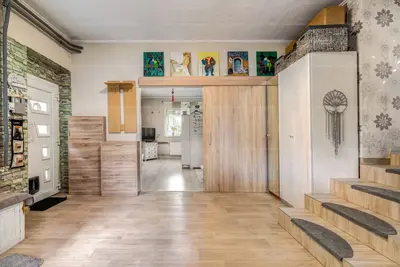 A főépület lakóterülete 100 m2, elrendezése praktikus és kényelmes: tágas nappali, külön konyha, valamint néhány lépcsőfokkal feljebb 2 szoba és egy kellemes méretű fürdőszoba kapott helyet.