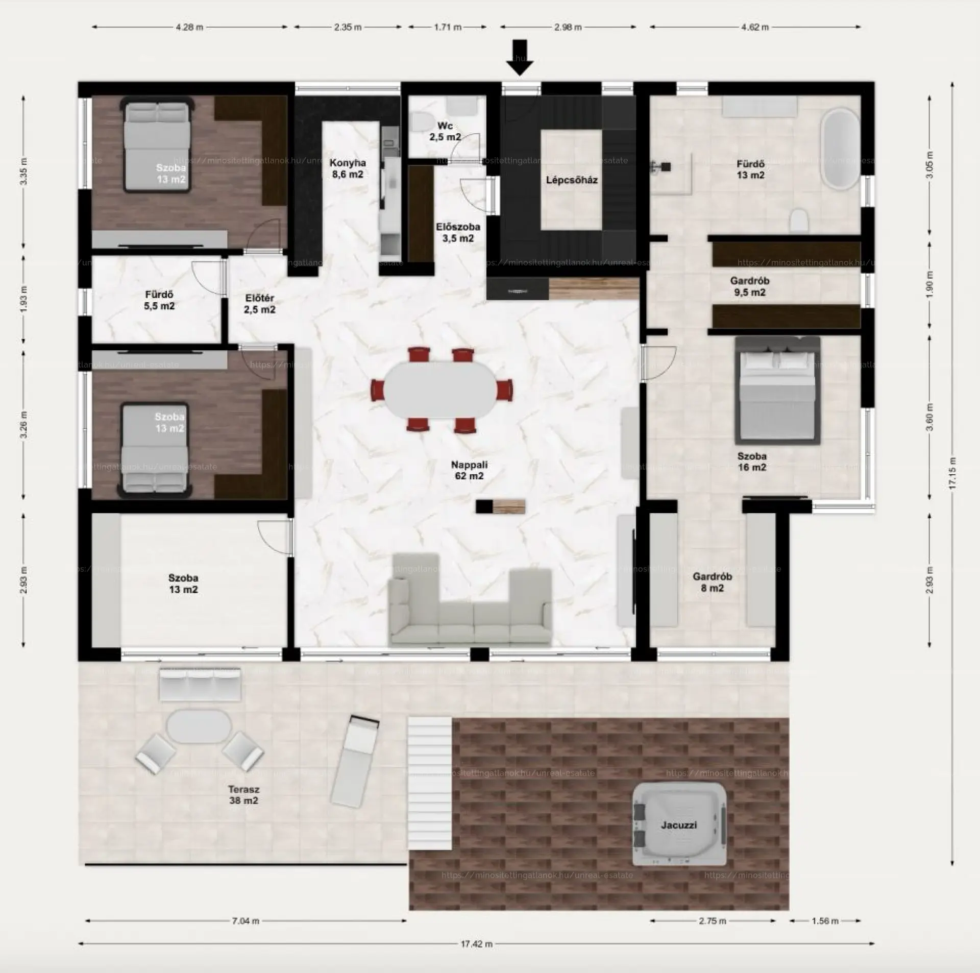 - 2 Nappali + 6 tágas hálószoba saját fürdőszobákkal és gardróbbal + 1 szoba az emeleten kialakítható