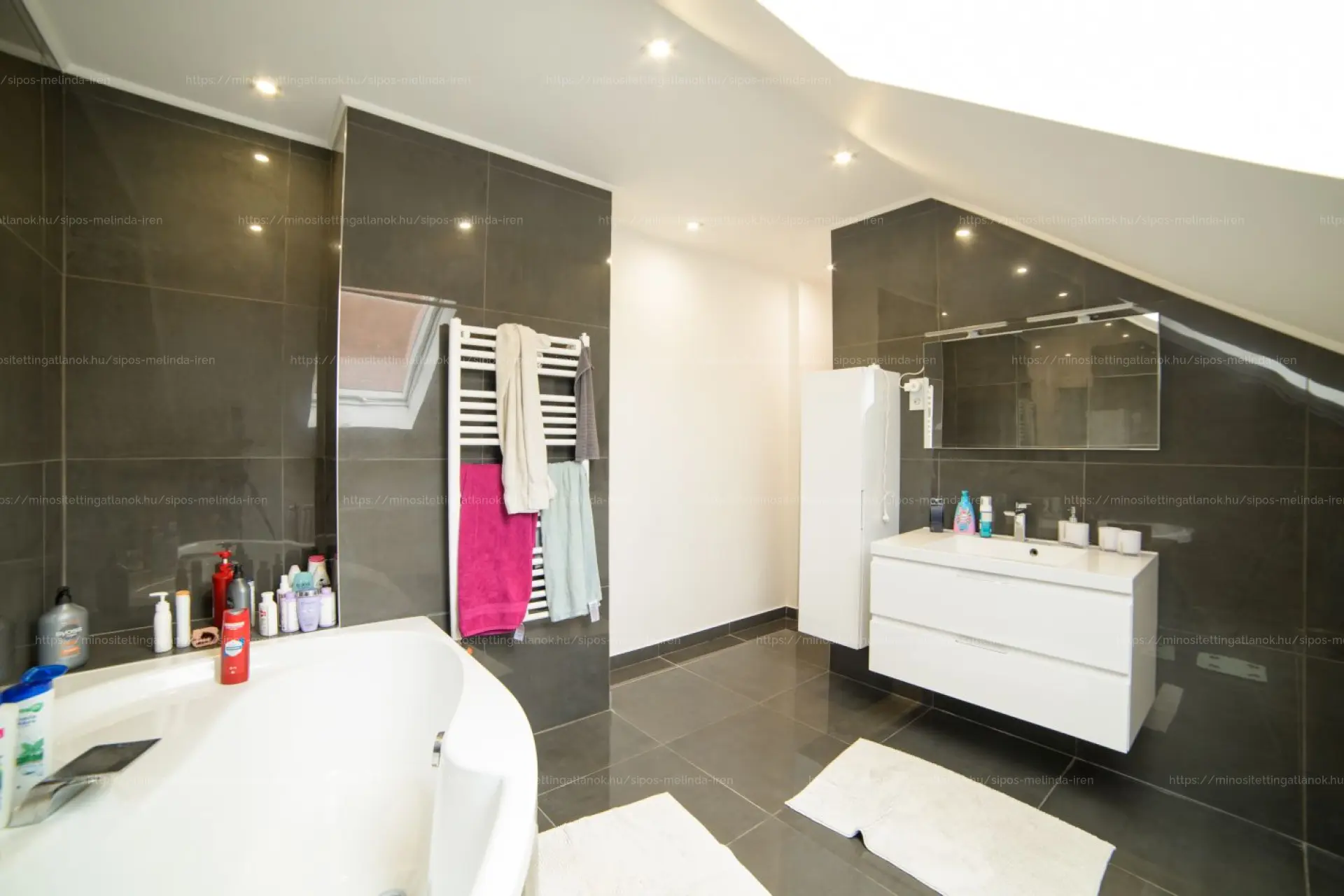 A felső szintre egy impozáns falépcsőn jutunk fel, ahol nagyon jó elrendezéssel vendégszoba erkéllyel, mosókonyha, mellékhelyiség, sarokkádas igényes fürdőszoba, hálószoba klímával - mely jelenleg gyerekszoba - és egy hatalmas hálószoba kapott helyet nagy gardróbbal, klímával felszerelve. A klímák mindenhol hűtő/fűtő berendezésűek.
