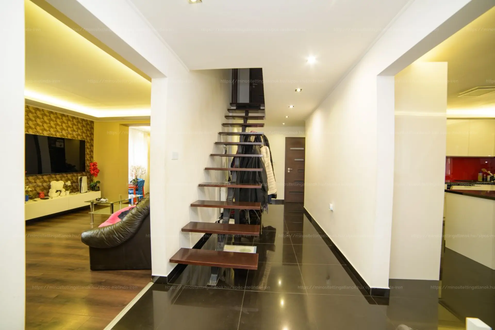 A ház alsó szintjén az előszobából nyílik a nagy 30 nm-es nappali, hátsó részén teraszajtóval. A nappalival szemben a 27 nm-es tágas, gépesített konyha található, magasfényű fehér beépített nagy méretű konyhabútorral, étkezőrésszel. A konyhabútor a vételár részét képezi. A terek világosak, légiesek, a mai designe-nak megfelelő burkolóval, mennyezeti megvilágítással. Ezen a szinten találunk még egy zuhanykabinos fürdőszobát és mellette egy mellékhelyiséget. Pár lépcsőt lehaladva a kazánház is innen közelíthető meg (jelenleg dolgozószobaként is funkcionál), ahol egy 24 kW-os kondenzációs gázkazánt építettek be puffer tartállyal 2018-ban, így ez is szolgáltathatja az otthon melegét. Innen egy hátsó kijáraton juthatunk a garázshoz.