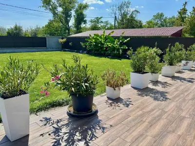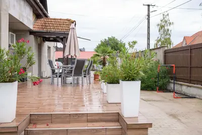 A ház két oldalán körben kb. 90 nm-es teraszt találunk, igényes kültéri burkolóval, mely kényelmes lehet családi összejövetelekre, sütögetésre, pihenésre.