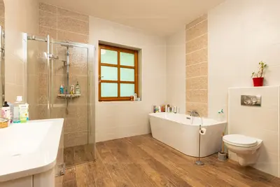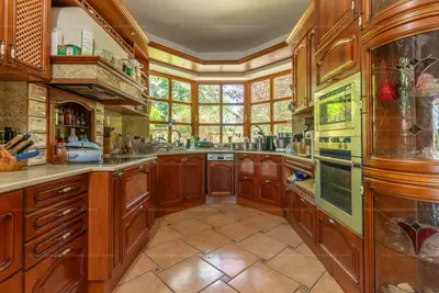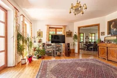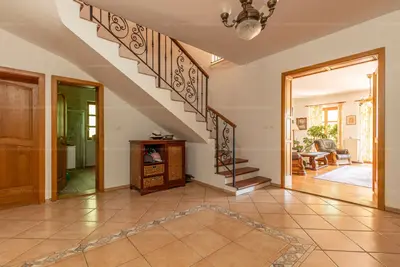 Az épület összesen több mint 400 m² lakótérrel rendelkezik, három szinten elosztva. A földszinten tágas nappali, kandalló, étkező és teraszkapcsolatos konyha található, valamint egy különálló szoba saját fürdővel. Az emeleten több hálószoba, gardróbok, illetve külön fürdőhelyiségek biztosítják a kényelmet. A tetőtér beépített, akár dolgozószobának vagy vendégszobának is ideális lehet.