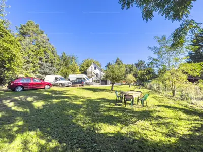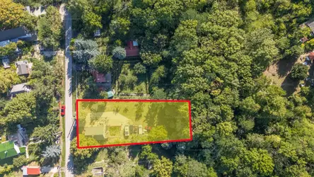 A telek végében ősfás erdő, kertben gyümölcsfák vannak.