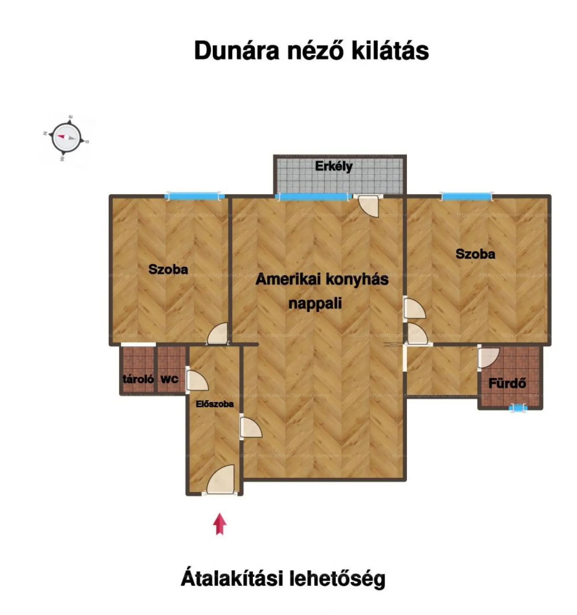 Könnyen amerikai konyhás nappali + 2 hálószobás elrendezéssé alakítható