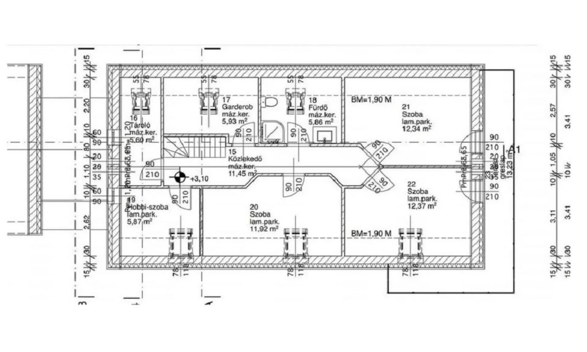 - 5 szoba + nappali + konyhaétkező, előszoba, háztartási helyiség, 2 fürdőszoba, vendég mosdó, 2 gardrób