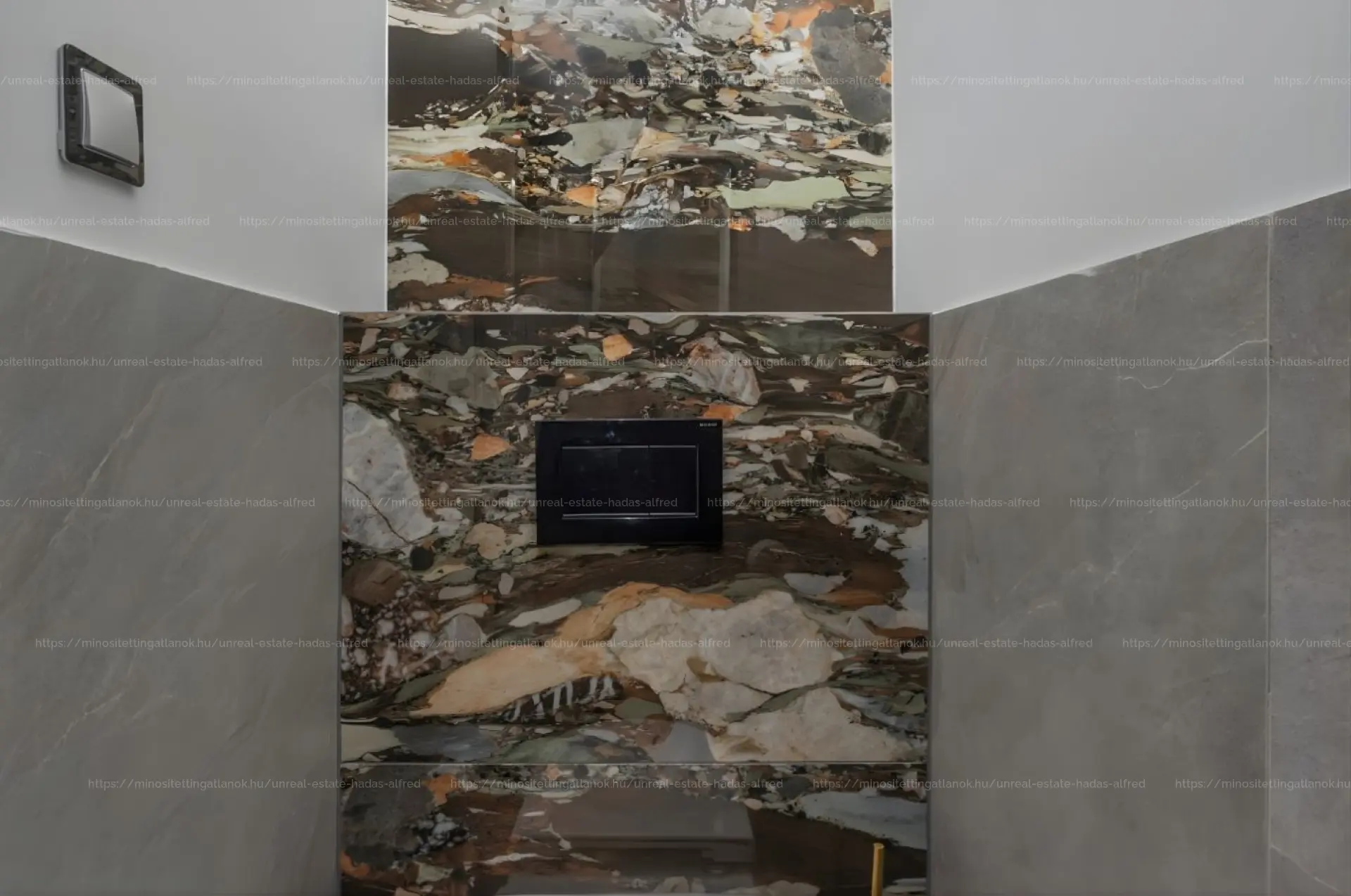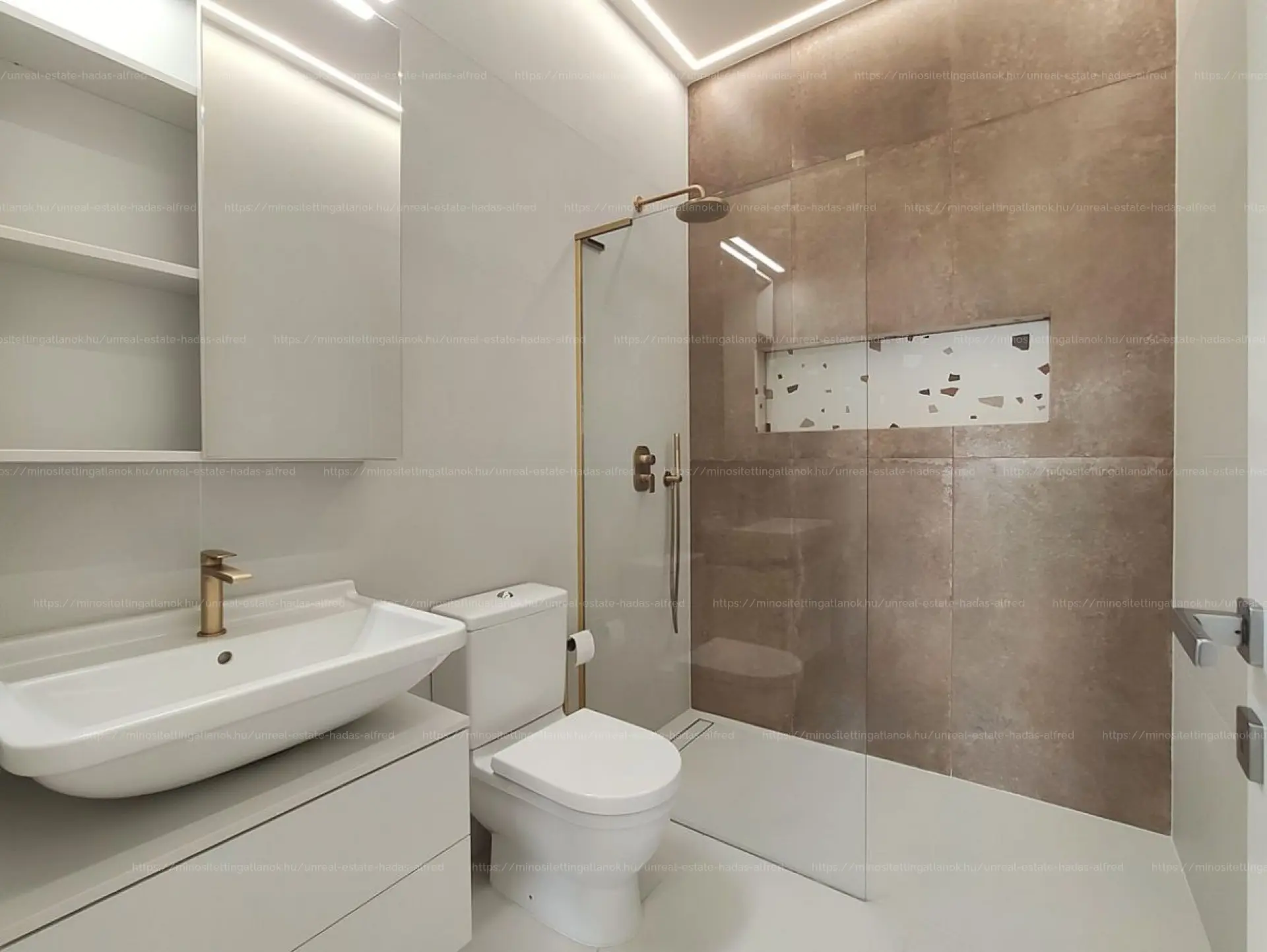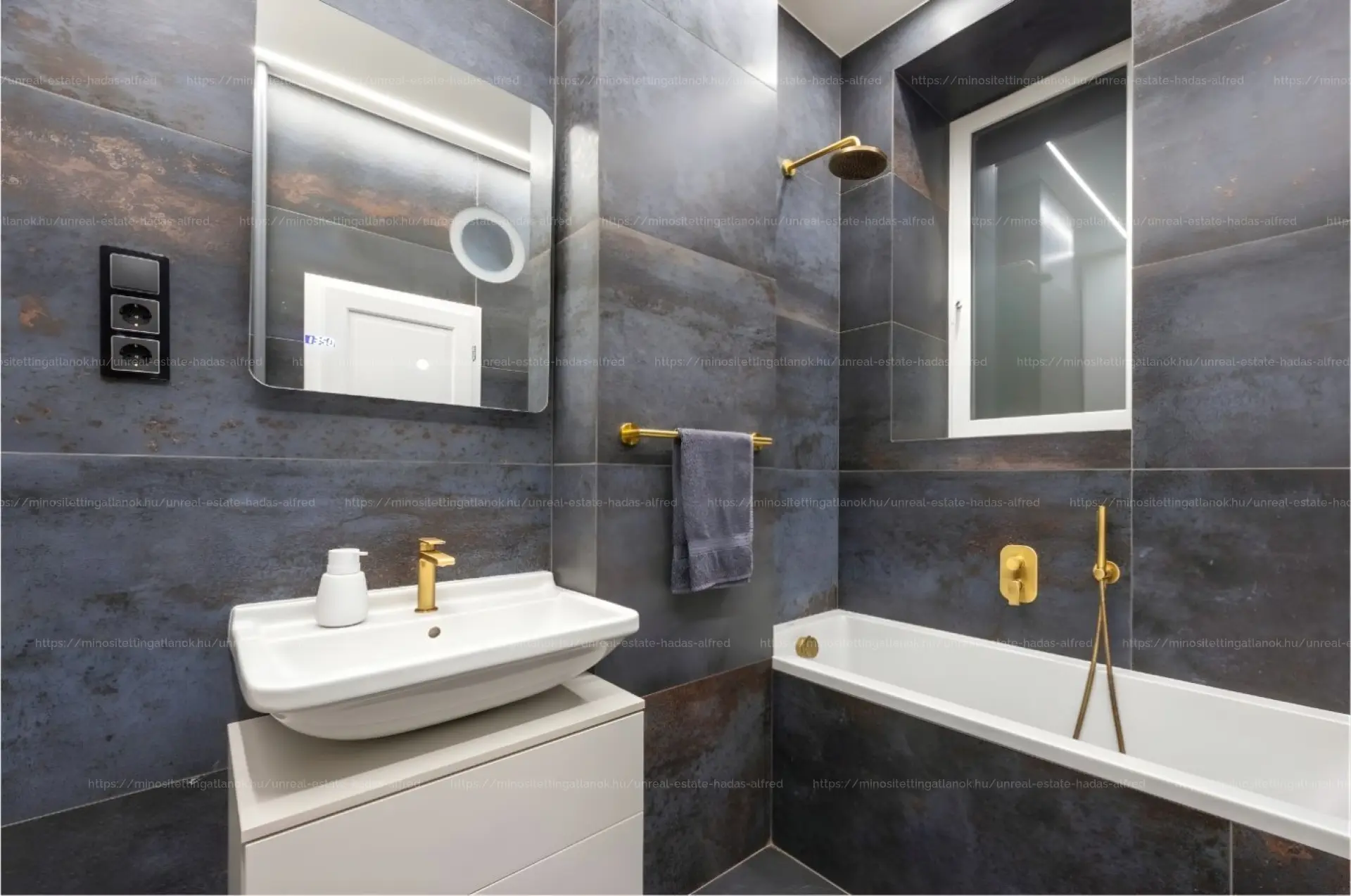 Burkolatok/szerelvények: Italgraniti csempe (60x120 cm), Bugnatese réz csaptelepek.