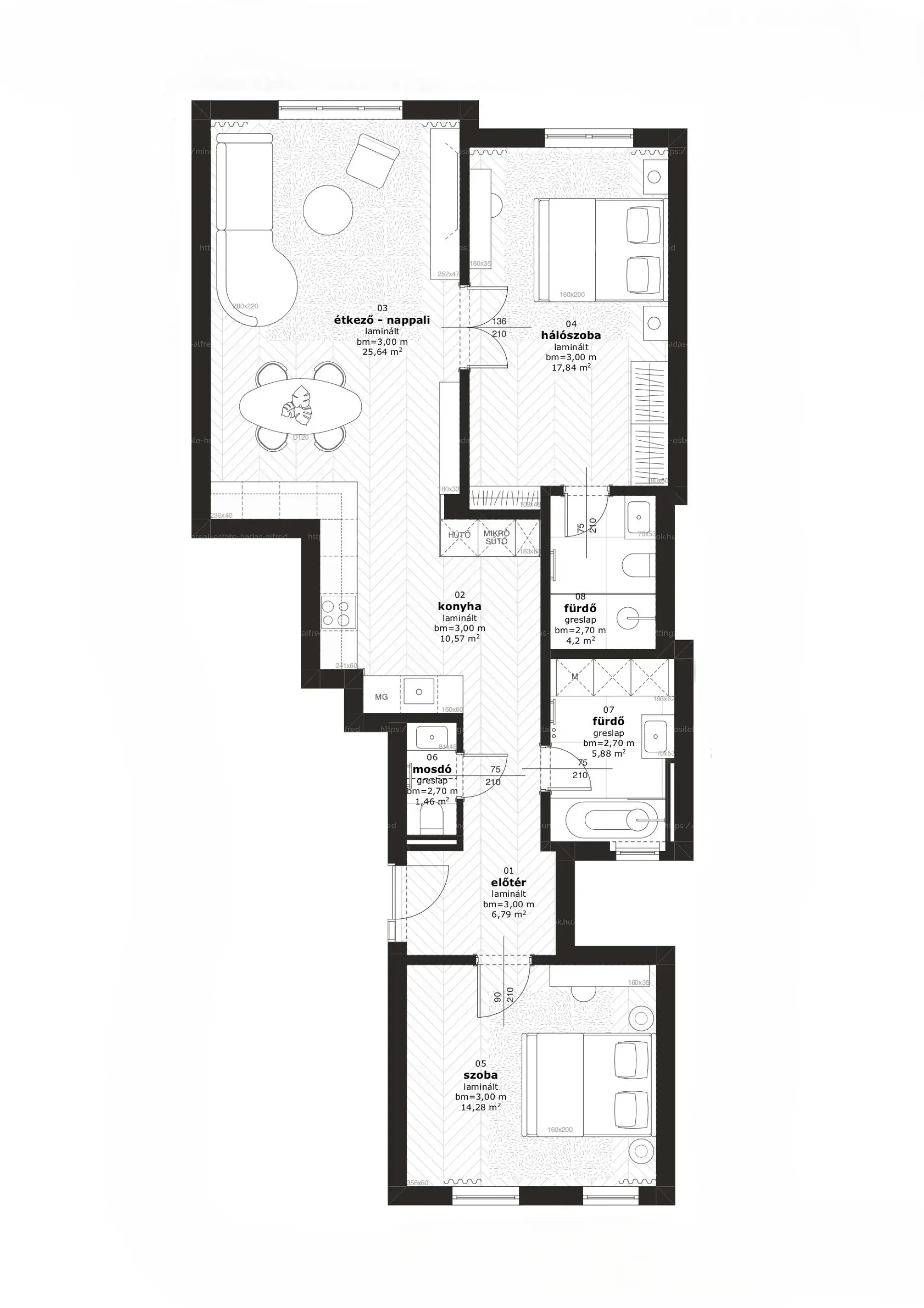 - Amerikai konyhás nappali, 2 hálószoba, 2 fürdőszoba, vendég WC