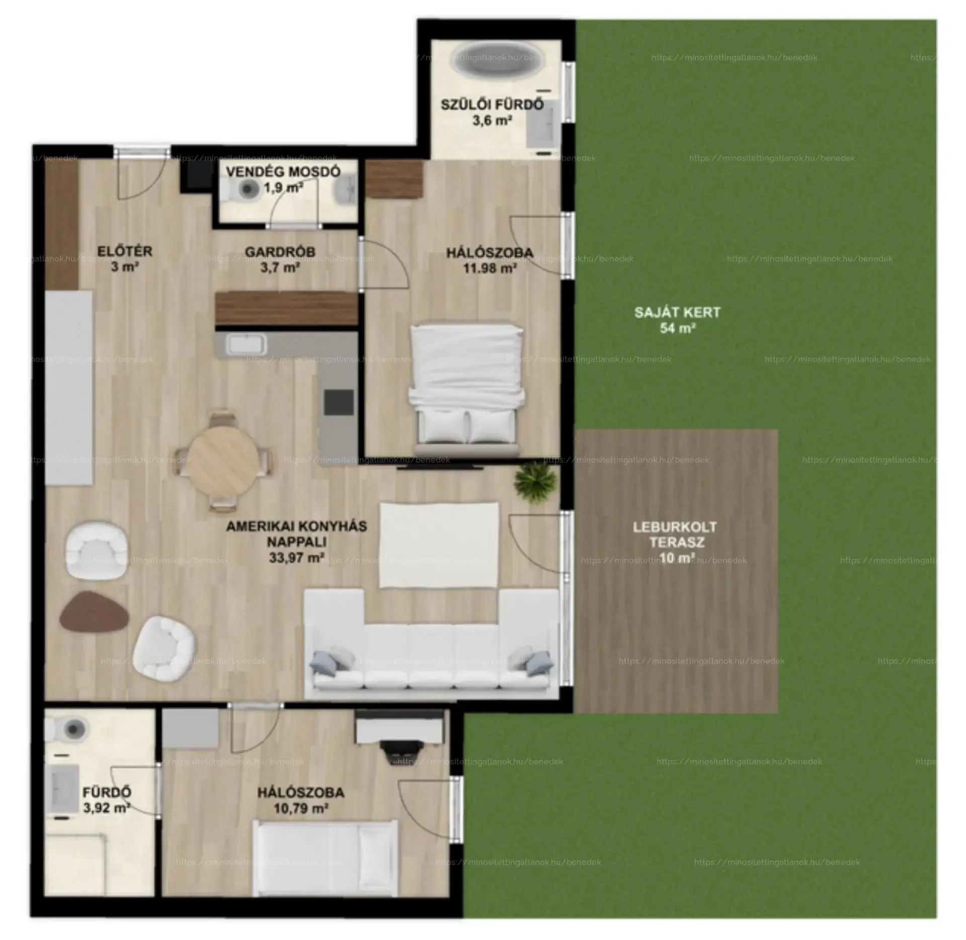 - Kert: kb. 60 m² saját használatú, amely akár igény szerint bővíthető