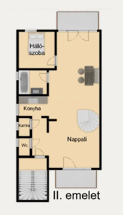 - Második emelet: belső kétszintes, tetőtér beépítéssel, 2 erkéllyel, terasszal