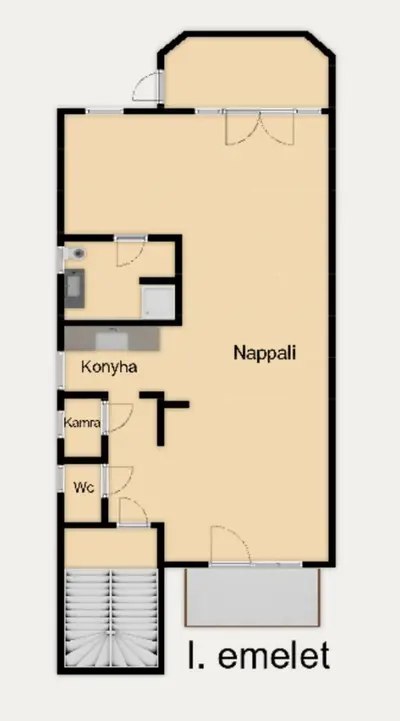 - Első emelet: 60 nm teljes lakószint, erkéllyel, hátul kertkapcsolatos terasszal
