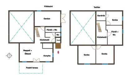 Az épület földszintjén nappali, étkező konyha, tusolós fürdőszoba és külön wc helyiségek találhatók. Az étkező és nappali helyiséghez csatlakozik egy 15 m-es fedett terasz. A tetőtérben 3 szoba és egy fürdőszoba található.