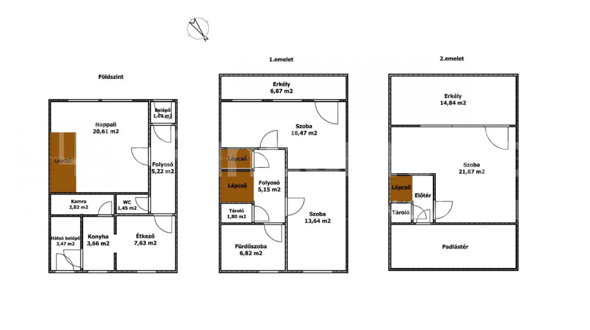 Az első emeleten két teljes értékű szoba kapott helyet, melyek közül az egyikhez erkély is kapcsolódik. A szinten található még egy fürdőszoba WC-vel, közlekedő és egy tároló. A második emeleten egy újabb, szintén erkélykapcsolatos szoba várja új tulajdonosát, továbbá egy tárolóhelyiség, ahol akár újabb WC is kialakítható, és innen érhető el a padlástér is.