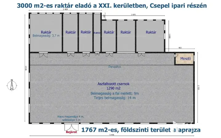 GROUND FLOOR: 1767 sqm, of which 1290 sqm is an enormous hall area. In the asphalt-floored hall, the 9-meter ceiling height along the walls and the total height of 14 meters allow for installing high racking systems or large machinery lines without any difficulty.