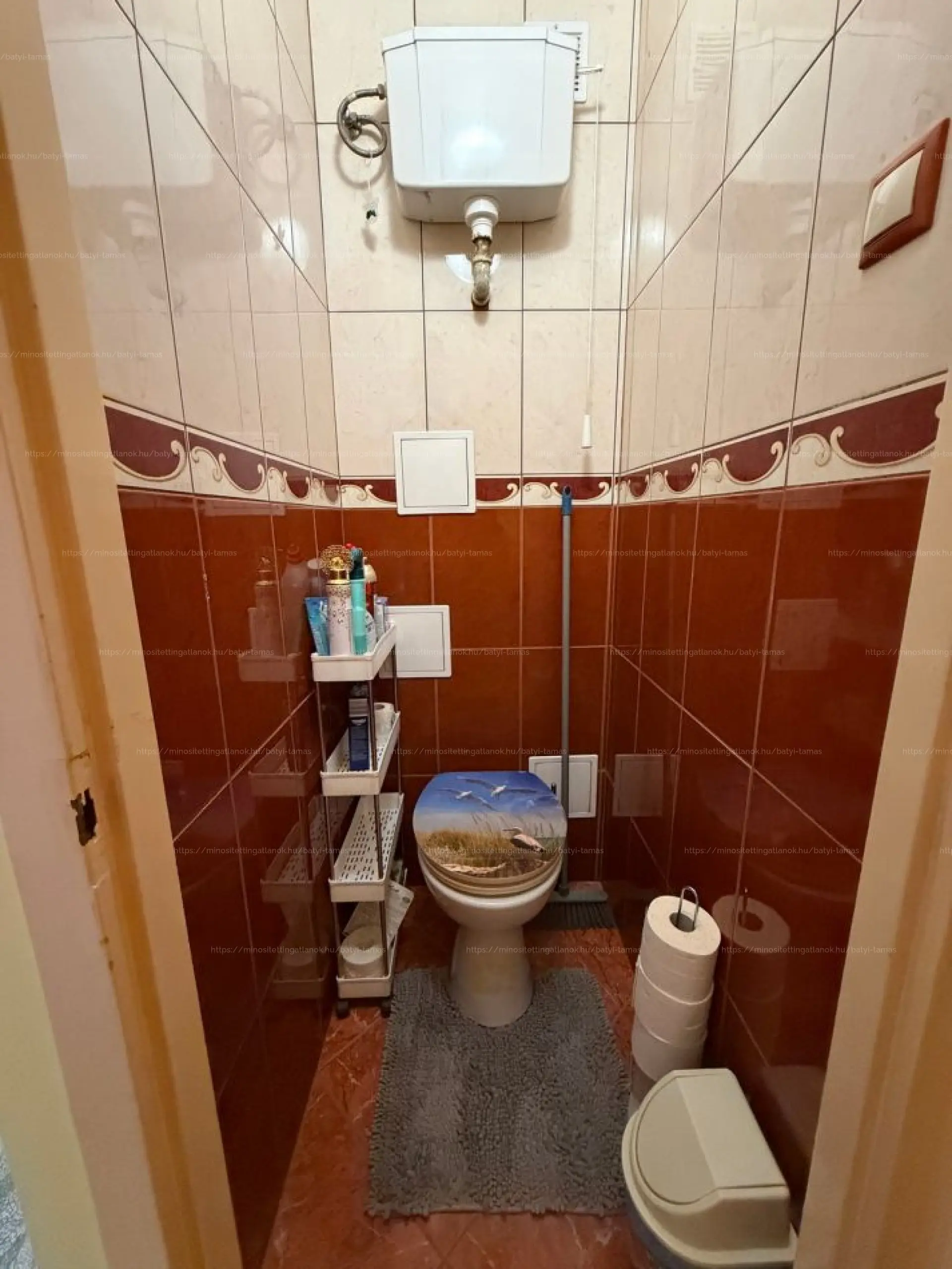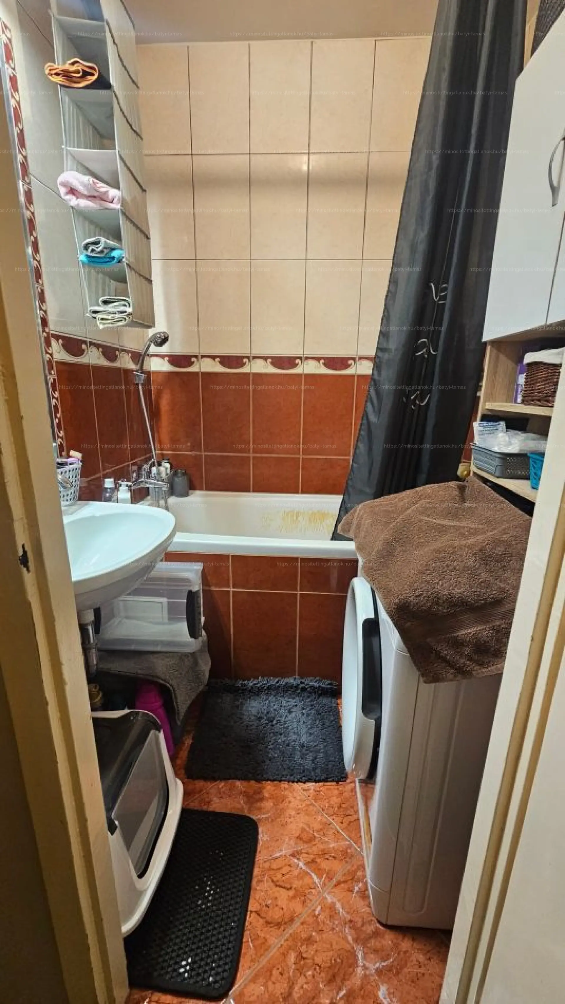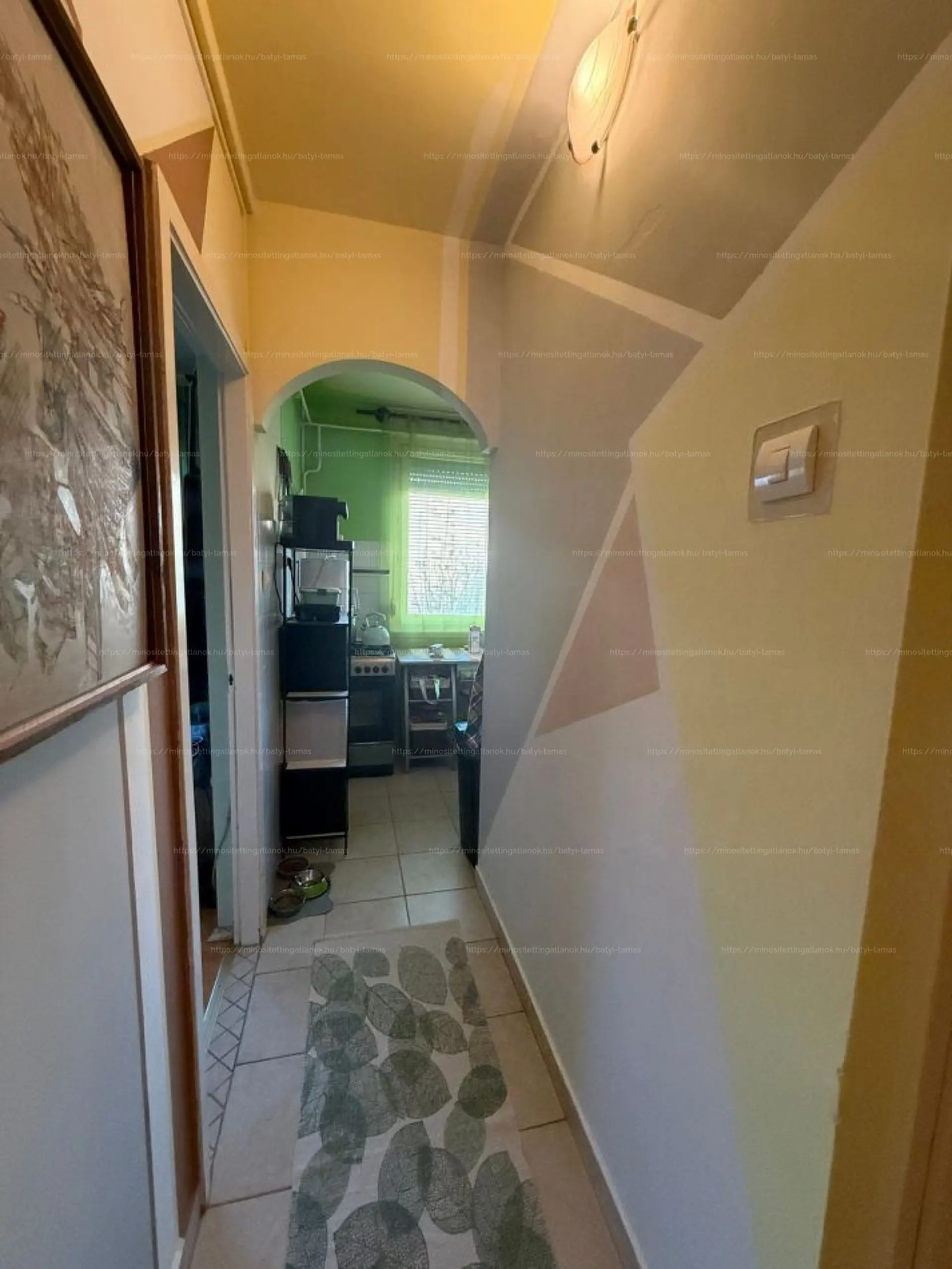 A lakás átlagos állapotú, a fürdőszoba és a WC külön helyiségben található. A fürdőszobában a kád cseréjére szükség lesz. A szobák laminált parkettásak, a többi helyiség járólappal burkolt, a falak festettek.